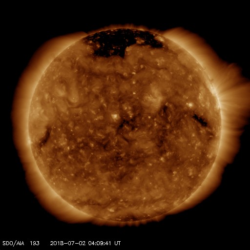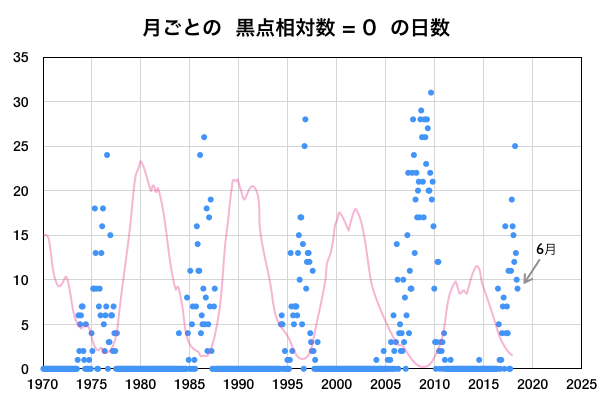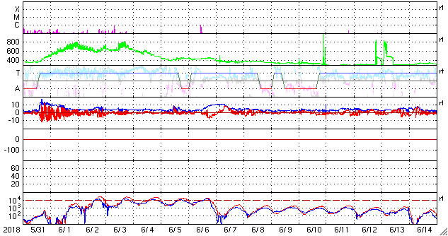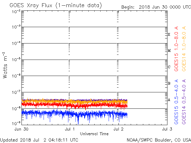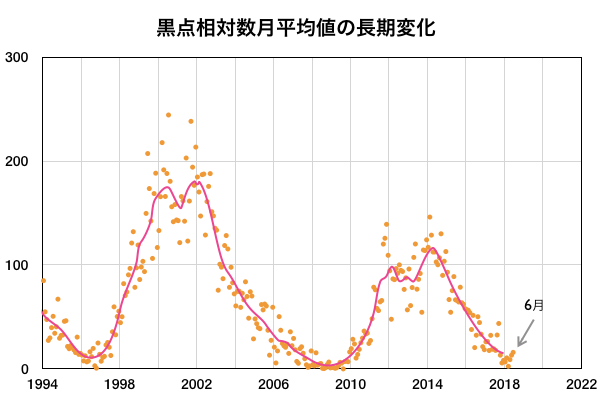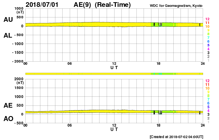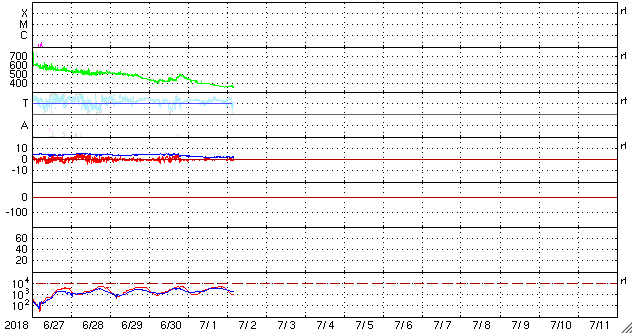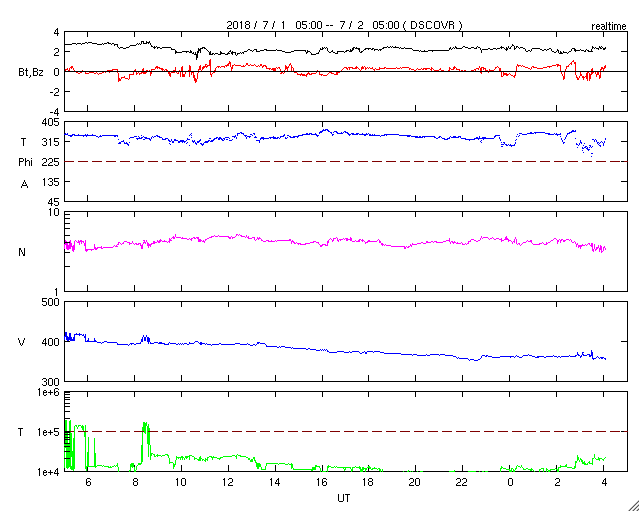 2018/ 7/ 2 13:19 更新 太陽風は低速になり、磁気圏も穏やかです。6月の黒点数は 15.9 でした。 担当 篠原 WDC-SILSOより、 6月の黒点相対数の平均値は、 15.9 と発表されました。 5月の 13.2 を、少しだけ上回っています。 C2のフレアを起こした2715黒点群など、 一時、3つの黒点群が見えるなど、 太陽面が少しにぎやかになっていた状況を示しています。 無黒点の日数も、9日と久しぶりに1桁に下がりました。 全体として見れば、太陽活動の極小へ向かう変化の途中で、 一時的に強まった程度の変化です。 今日の太陽は、無黒点です。 X線グラフに変化はなく、穏やかな状態が続いています。 太陽風の速度は、昨夕に400km/秒台を割り、 現在、360km/秒まで下がっています。 磁場強度も、3nTから2nTへ下がり、弱くなっています。 太陽風は穏やかになっています。 太陽風磁場の南北成分は、0nT付近に留まっています。 磁気圏の活動は穏やかで、AE指数は特に変化はありません。 SDO衛星AIA193の太陽写真の中央部にコロナホールはなく、 低速の穏やかな太陽風が続きそうです。