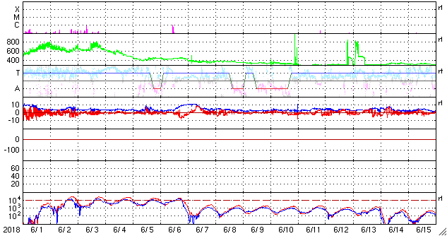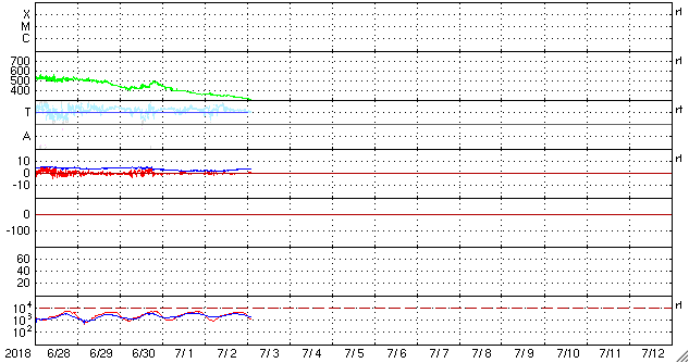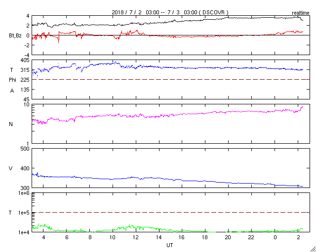 2018/ 7/ 3 11:39 更新 太陽風の速度は300km/秒近くまで下がっています。 担当 篠原 太陽風の速度は、昨日のニュース以降も低下を続け、 310km/秒まで下がっています。 完全に低速の風になっています。 磁場強度は、2nTから3〜4nTに少し上がっていますが、 値としては、やや弱い状態です。 磁場の南北成分は、0nT付近で小さくなっています。 速度が遅くなっていることもあって磁気圏は穏やかで、 AE指数のグラフは、ほとんど変化がありません。 SDO衛星AIA193の太陽コロナ写真は、 北極域を除くと、全体がぼんやりと光っていて、 コロナホールは見られません。 27日周期の図の前周期と同様に、 低速の穏やかな太陽風がしばらく続きそうです。 太陽は今日も無黒点です。 X線グラフも変化はなく、太陽はとても穏やかです。 ![]() SDO衛星のAIA193カメラによる太陽コロナの様子 (c) SDO (NASA) ![]() SDO衛星による太陽の可視光写真 (c) SDO (NASA) ![]() DSCOVRが観測した太陽風の磁場(1番上の枠、黒線は全体の強度、赤線は南北成分) および、太陽風の密度(3番目の紫線)、速度(4番目の青線) (c) データ:NOAA/SWPC、作図:宇宙天気ニュース ![]() AE指数(速報値) 下段のAEグラフの値が高くなると、オーロラ活動が活発化しています。 (c) 京都大学WDC ![]() ![]() 27日の太陽周期に合わせたデータプロット 太陽が同じ面を地球に向けていた27日前の変化から、今後を予想することができます。 (c) 作図:宇宙天気ニュース