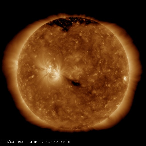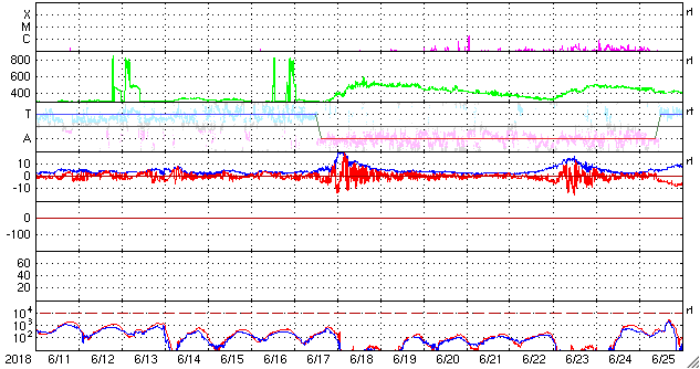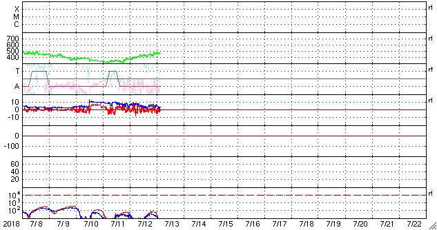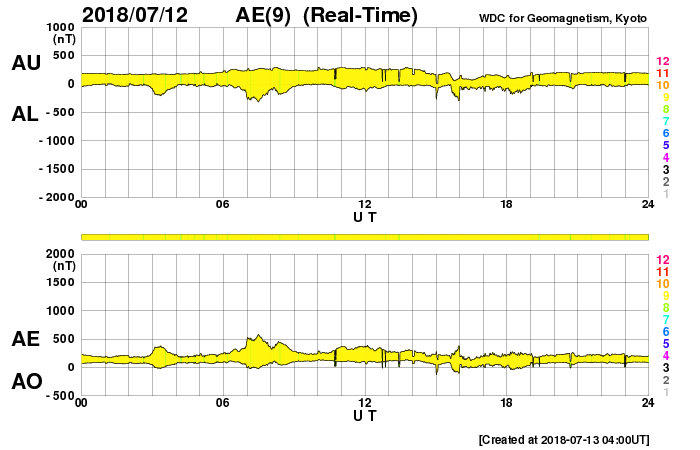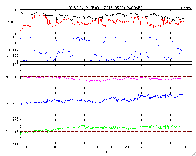 2018/ 7/13 13:05 更新 太陽風は480km/秒とやや高速になっています。 担当 篠原 昨日370km/秒へ少し上がっていた太陽風の速度は、 その後もゆっくりと上昇して、480km/秒に達しています。 太陽風は、やや高速の風になっています。 磁場強度は、3nTへ下がってやや弱くなっています。 27日周期の図の前周期には見られなかった太陽風の高まりが、 7月5〜9日に続いてやって来た用です。 太陽風磁場の南北成分は、変化は小さいですが、 南北に振れています。 磁気圏では小規模の活動が起きている様で、 AE指数は、やや見にくくなっていますが、 所々で小規模の変化が起きている様です。 この後、太陽風はどの様に推移するでしょうか。 SDO衛星AIA193の太陽コロナ写真では、 目立つほどのコロナホールは見られません。 太陽は、SDO衛星AIA193の写真の西端(右端)近くに 明るく光る小さい領域が発生しています。 可視光の拡大写真では、非常に小さい黒点が発生している様ですが、 番号が付けられるかどうかは分かりません。 X線グラフは変化は見られず、太陽は穏やかです。 ![]() SDO衛星のAIA193カメラによる太陽コロナの様子 (c) SDO (NASA) ![]() SDO衛星による太陽の可視光写真 (c) SDO (NASA) ![]() DSCOVRが観測した太陽風の磁場(1番上の枠、黒線は全体の強度、赤線は南北成分) および、太陽風の密度(3番目の紫線)、速度(4番目の青線) (c) データ:NOAA/SWPC、作図:宇宙天気ニュース ![]() AE指数(速報値) 下段のAEグラフの値が高くなると、オーロラ活動が活発化しています。 (c) 京都大学WDC ![]() ![]() 27日の太陽周期に合わせたデータプロット 太陽が同じ面を地球に向けていた27日前の変化から、今後を予想することができます。 (c) 作図:宇宙天気ニュース