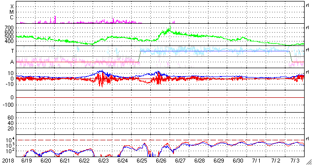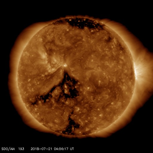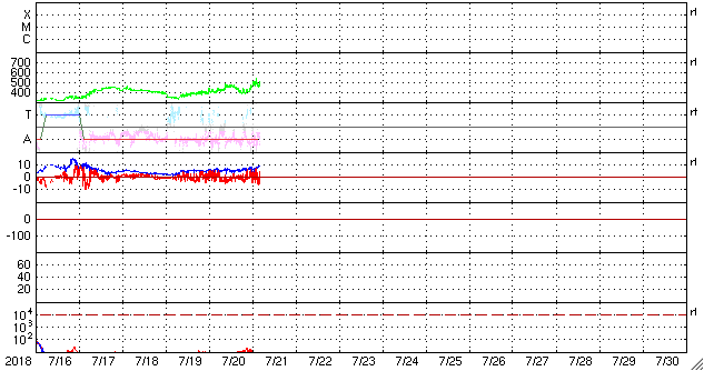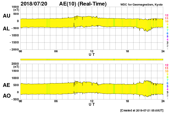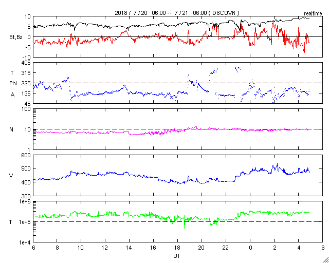 2018/ 7/21 14:07 更新 太陽風は500km/秒に高まっています。小さい黒点が発生しています。 担当 篠原 太陽風の速度は、昨日の400km/秒から次第に高まって、 現在は500km/秒と高速の風になっています。 磁場強度も、5nTから9nTへ強まっています。 磁場の南北成分は、0nTか弱い南向きになる傾向が続き、 グラフの最後で-5nTに達する南向きが発生しています。 速度がやや高まっていることもあり、 磁気圏の活動もある程度高まっていると思われますが、 AE指数のグラフは、データエラーのため太くなっていて、 活動の様子は読み取れなくなっています。 現在の太陽風の高まりは、この後どの様に推移するでしょうか。 一方、SDO衛星AIA193では、 次のコロナホールが南半球に広がっています。 先頭が中心線に達したところで、 3日後の24日頃から影響が始まりそうです。 太陽は、中央部のやや北東側(左上)に, 小さい黒点が出現しています。 SDO衛星AIA193の写真でも、明るく光っています。 この後、目立つほどの大きさに成長するでしょうか。