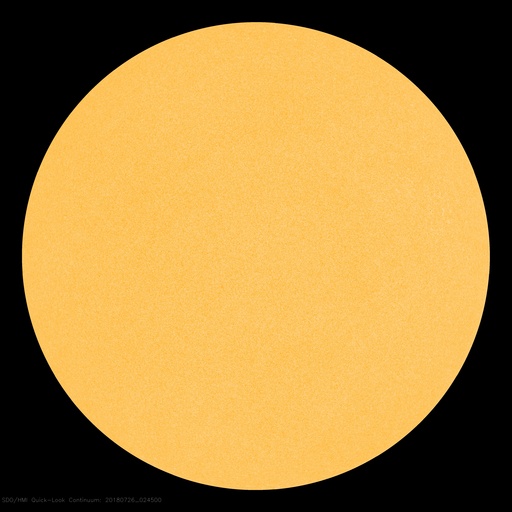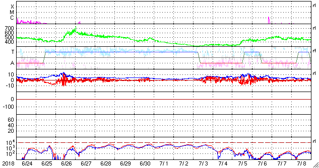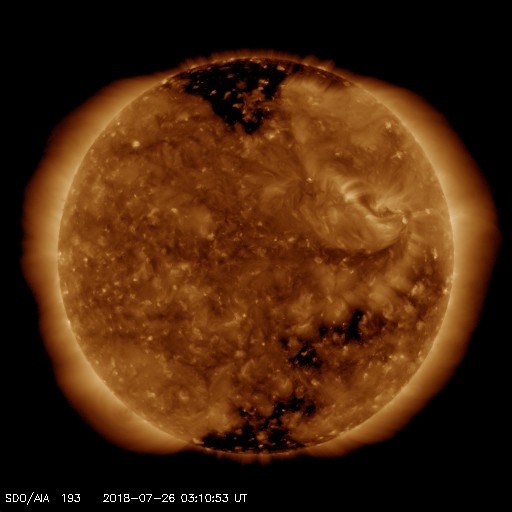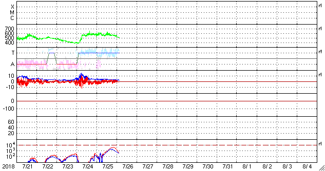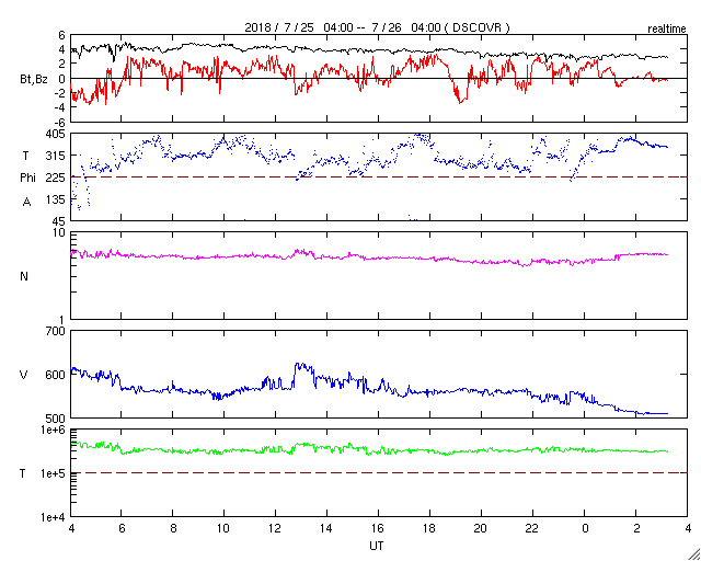 2018/ 7/26 12:27 更新 高速太陽風は続いていますが、速度は少し下がっています。 担当 篠原 高速の太陽風は、その後、600km/秒に達する変化をしながら、 今朝までは550km/秒で推移して、 その後、一段下がり、現在は500km/秒近くになっています。 高速の状態は続いていますが、勢いは下がってきたところです。 太陽風の磁場強度も、4nTから3nTへ少し下がり、 やや弱くなっています。 磁場の南北成分は、北寄りに傾向が変わっている様です。 AE指数は分かりにくい状態が続いていますが、 変化は少なくなっている様です。 SDO衛星AIA193では、南半球のコロナホールは、 次第に南極へ向かって緯度を上げています。 このため、地球への影響は次第に弱まりそうです。 高速の風はどこまで続くでしょうか。 太陽では、掲載の可視光写真では分かりませんが、 SDO衛星の拡大写真を見ると、 西の端近くに非常に小さい黒点ができている様です。 分かるほどの大きさになるか、このまま消えてしまうのか、 今後、どう推移するでしょうか。 X線グラフに変化はなく、太陽は穏やかです。