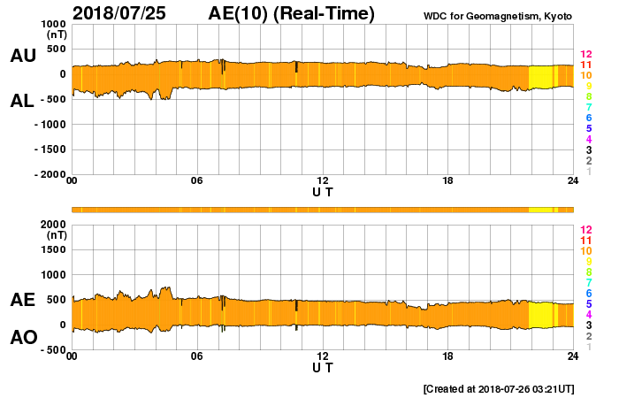 (c) SDO (NASA) ![]() SDO衛星による太陽の可視光写真 (c) SDO (NASA) ![]() DSCOVRが観測した太陽風の磁場(1番上の枠、黒線は全体の強度、赤線は南北成分) および、太陽風の密度(3番目の紫線)、速度(4番目の青線) (c) データ:NOAA/SWPC、作図:宇宙天気ニュース ![]() AE指数(速報値) 下段のAEグラフの値が高くなると、オーロラ活動が活発化しています。 (c) 京都大学WDC ![]() ![]() 27日の太陽周期に合わせたデータプロット 太陽が同じ面を地球に向けていた27日前の変化から、今後を予想することができます。 (c) 作図:宇宙天気ニュース