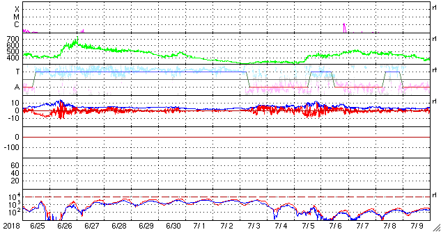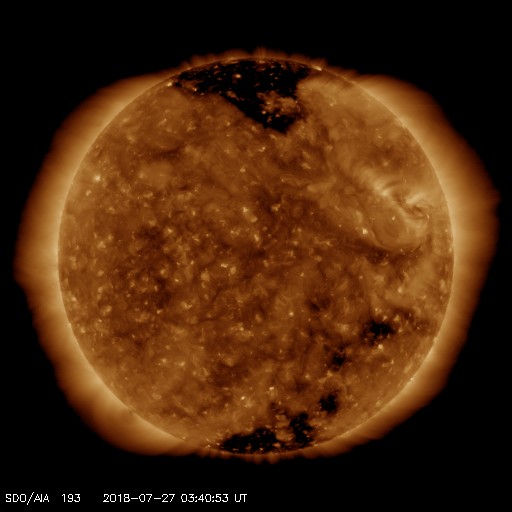 - 2018/ 7/25 12:25 高速太陽風が到来し、550km/秒に高まっています。