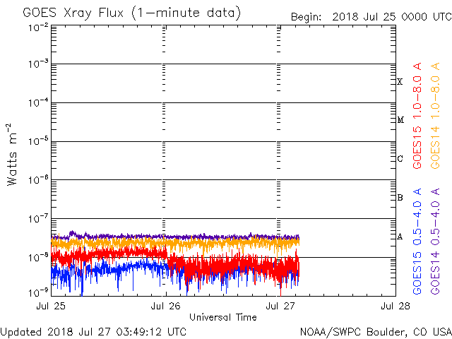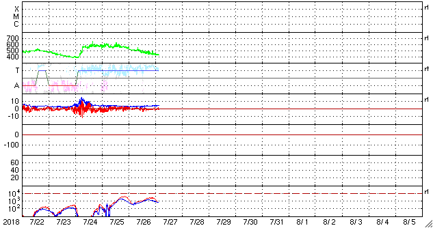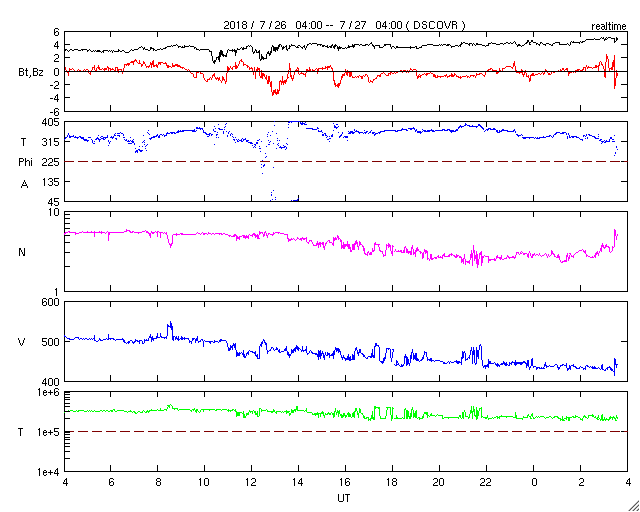 - 2018/ 7/26 12:27 高速太陽風は続いていますが、速度は少し下がっています。