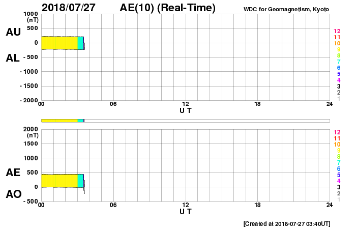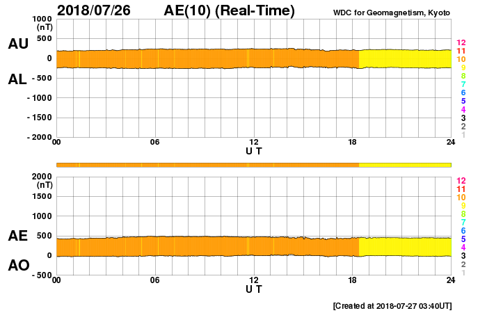 下段のAEグラフの値が高くなると、オーロラ活動が活発化しています。
