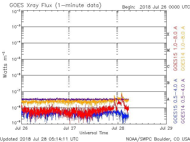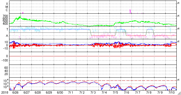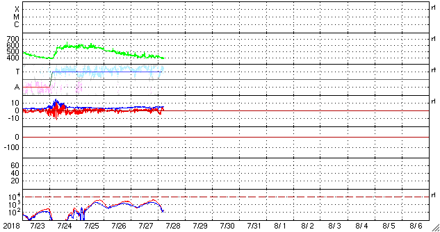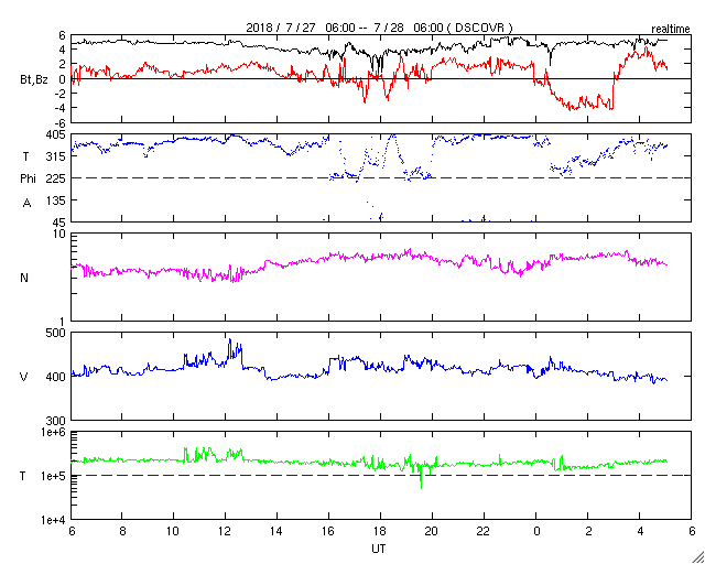 2018/ 7/26 12:27 高速太陽風は続いていますが、速度は少し下がっています。