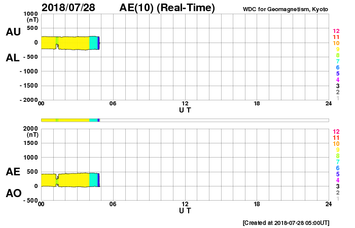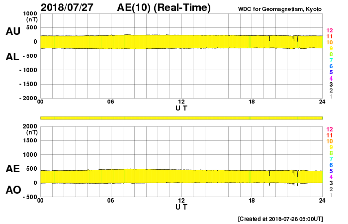 下段のAEグラフの値が高くなると、オーロラ活動が活発化しています。