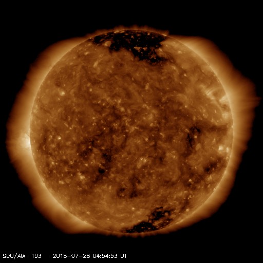 2018/ 7/25 12:25 高速太陽風が到来し、550km/秒に高まっています。