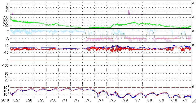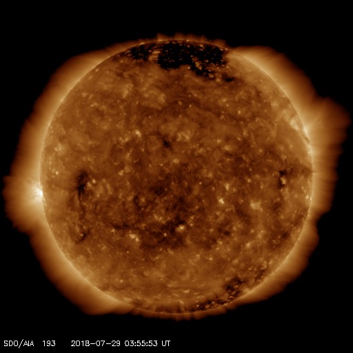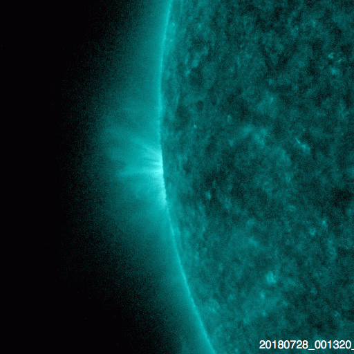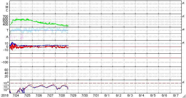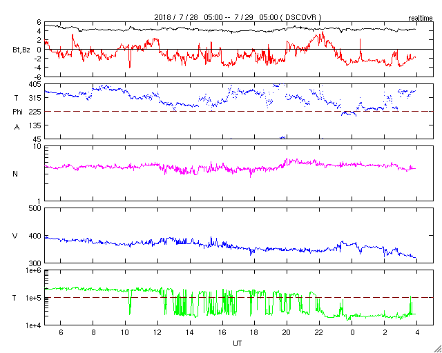 2018/ 7/29 13:01 更新 太陽風は低速になっています。 担当 篠原 太陽の東端(左端)に、活動的な領域が近付いています。 可視光写真では、拡大すると白斑が見え始めています。 SDO衛星AIA131では(1枚目の動画)、 小さい活動が活発に起きています。 この後、黒点が見えてくるでしょうか。 太陽風は、速度が400km/秒から320km/秒へ下がり、 低速になっています。 磁場強度は、5nTから4nTに少し下がっています。 太陽風磁場の南北成分は、弱い南寄りになっています。 速度が下がっているので、限定的だと思いますが、 磁気圏では弱い活動が起きている可能性があります。 SDO衛星AIA131の太陽コロナ写真では、 特にコロナホールは見られず、 穏やかな太陽風がしばらく続きそうです。 ![]() 太陽の東端に見えてきた活動領域の様子。SDO衛星AIA131。 (c) SDO (NASA)、(動画加工 : 宇宙天気ニュース) ![]() SDO衛星のAIA193カメラによる太陽コロナの様子 (c) SDO (NASA) ![]() SDO衛星による太陽の可視光写真 (c) SDO (NASA) ![]() DSCOVRが観測した太陽風の磁場(1番上の枠、黒線は全体の強度、赤線は南北成分) および、太陽風の密度(3番目の紫線)、速度(4番目の青線) (c) データ:NOAA/SWPC、作図:宇宙天気ニュース ![]() AE指数(速報値) 下段のAEグラフの値が高くなると、オーロラ活動が活発化しています。 (c) 京都大学WDC ![]() ![]() 27日の太陽周期に合わせたデータプロット 太陽が同じ面を地球に向けていた27日前の変化から、今後を予想することができます。 (c) 作図:宇宙天気ニュース