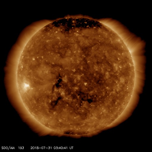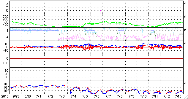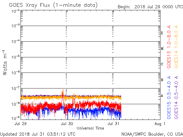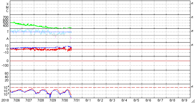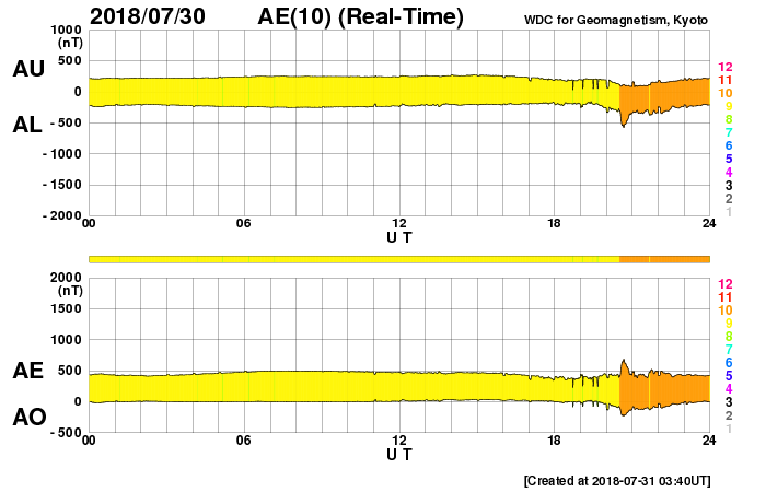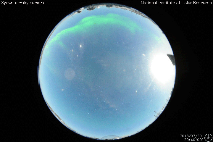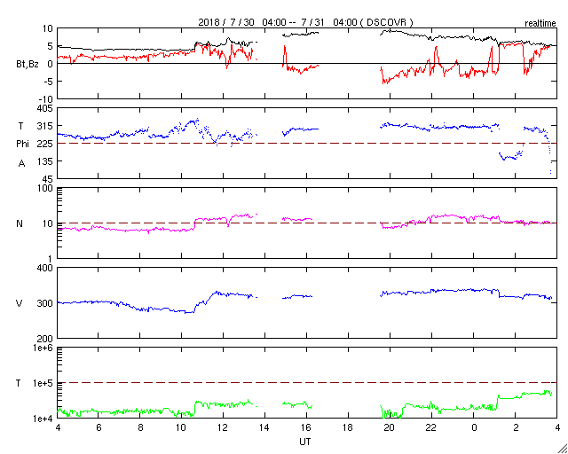 2018/ 7/31 12:51 更新 太陽風磁場がやや強まりました。低速風は続いています。 担当 篠原 昨夜遅くから今朝にかけて、 太陽風の磁場強度が、10nT近くに強まる変化が発生しています。 現在は、5nTに戻っています。 一方、太陽風の速度は、 300km/秒から330km/秒に少し高まる変化が見られた程度で、 低速の状態が続いています。 太陽風磁場の南北成分は、 強度が高まったことで、南北にもやや大きく振れて、 -5nT程度の南向きの変化も発生しています。 速度が下がっているため、大きな変化にはなっていませんが、 AE指数のグラフでは、31日5時半(世界時30日20時半)頃に、 変化の高まりが見えています。 南極の昭和基地でも、オーロラの高まりが見えていました。 全天カメラによる動画を掲載します。 27日周期の図を見ると、 前周期も7月3日に磁場強度の高まりが始まっています。 この時は、2日ほど経った頃に速度の高まりが始まったのですが、 今回はどうなるでしょうか。 太陽は、東端の活動的な領域は、 掲載の可視光写真では白斑が見えるだけです。 X線グラフも変化はなく、穏やかな状態が続いています。