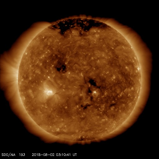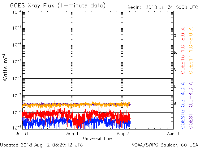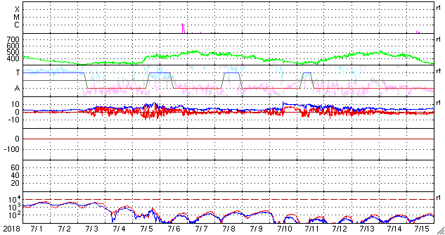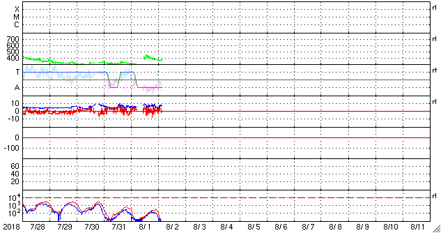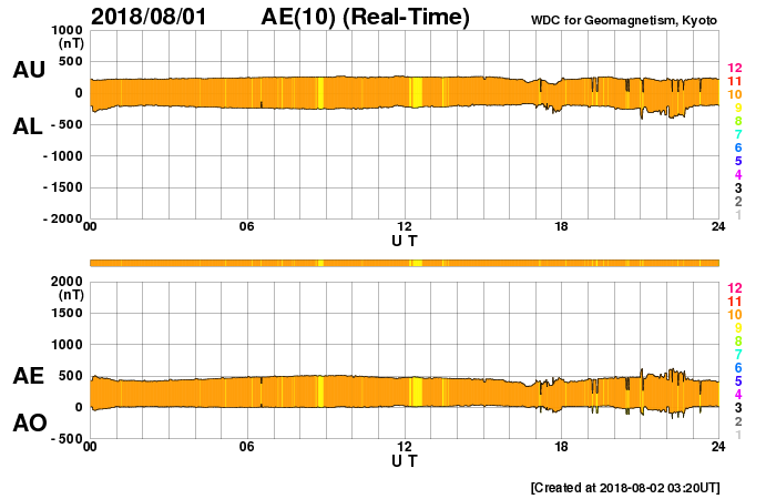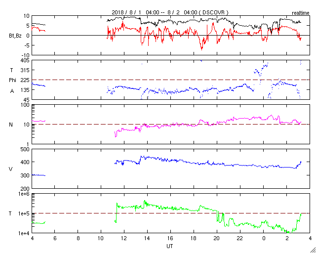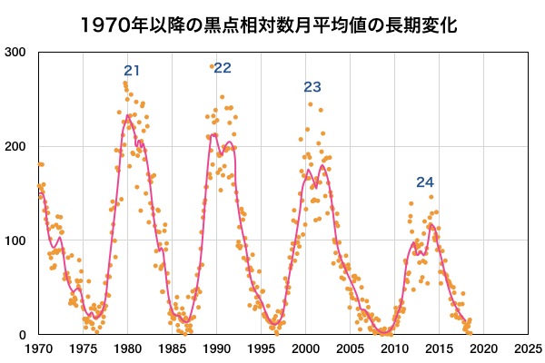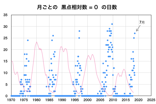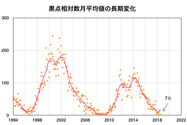 2018/ 8/ 2 12:30 更新 太陽に黒点が発生しています。7月の黒点数は 1.6 でした。 担当 篠原 WDC-SILSOより、 7月の黒点相対数の平均値は、 1.6 と発表されました。 月平均値が1桁台に下がったのは、4月の 8.9 以来、 今回の極小期では6回目です。 3月の 2.5 を下回って、今回の最小値になっています。 静かな太陽が長く続いて話題になった 前回の極小の時(2007〜2009年頃)は、 月平均値が 2 を割ったのは、2007年に1回、208年に4回、 2009年に5回と、計10回でした。 今回の極小期は、どのような経過をたどるのでしょうか。 また、1日の黒点相対数が 0 になる、無黒点日の日数は、27日でした。 これは、3月の 25日を超えて、今回の極小期の最大値です。 前回の極小の時は、無黒点日が27日に達したのは、 2007年に1回、2008年に3回、2009年に3回でした。 あれだけの極小の時でも、この程度しか発生していない記録です。 静かな方の記録は、なかなか分かりにくいですが、 引き続き注目してください。 今日の太陽は、南東側(左下)の活動的な領域に黒点が発生し、 2717群と番号が付いています。 SDO衛星の可視光写真によると、 昨日の昼過ぎから見え始めていた様です。 X線グラフには特に変化は見られず、 穏やかな状態が続いています。 太陽風は、昨夜にかけて速度が450km/秒へ高まる変化が到来し、 その後すぐに下がって行き、 現在は360km/秒と既に低速風に戻っています。 (グラフの最後で、400km/秒に上がる変化が見えています) 磁場強度は、5〜10nTの間を上下に変化しています。 27日周期の図の前周期に見られた速度の高まりが、 回帰したのかもしれません。 前回は5日近く続いたのですが、 今回は短い時間で終わってしまうのでしょうか。 ![]() 太陽黒点相対数の長期変化。7月の黒点相対数は 1.6 でした。 (c) 黒点データ:WDC-SILSO、作図:宇宙天気ニュース ![]() 1970年以降の太陽黒点相対数の長期変化。 (c) 黒点データ:WDC-SILSO、作図:宇宙天気ニュース ![]() 1970年以降の月毎の無黒点日の日数。 (c) 黒点データ:WDC-SILSO、作図:宇宙天気ニュース ![]() SDO衛星のAIA193カメラによる太陽コロナの様子 (c) SDO (NASA) ![]() SDO衛星による太陽の可視光写真。マウスの矢印を写真に重ねると、黒点番号付きの写真に切り替わります。 (c) SDO (NASA) ![]() GOES衛星の太陽X線データ (c) NOAA/SWPC ![]() DSCOVRが観測した太陽風の磁場(1番上の枠、黒線は全体の強度、赤線は南北成分) および、太陽風の密度(3番目の紫線)、速度(4番目の青線) (c) データ:NOAA/SWPC、作図:宇宙天気ニュース ![]() AE指数(速報値) 下段のAEグラフの値が高くなると、オーロラ活動が活発化しています。 (c) 京都大学WDC ![]() ![]() 27日の太陽周期に合わせたデータプロット 太陽が同じ面を地球に向けていた27日前の変化から、今後を予想することができます。 (c) 作図:宇宙天気ニュース