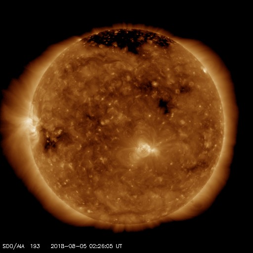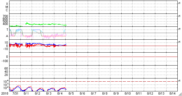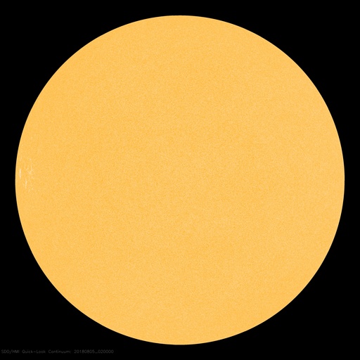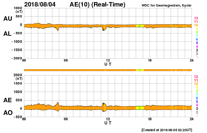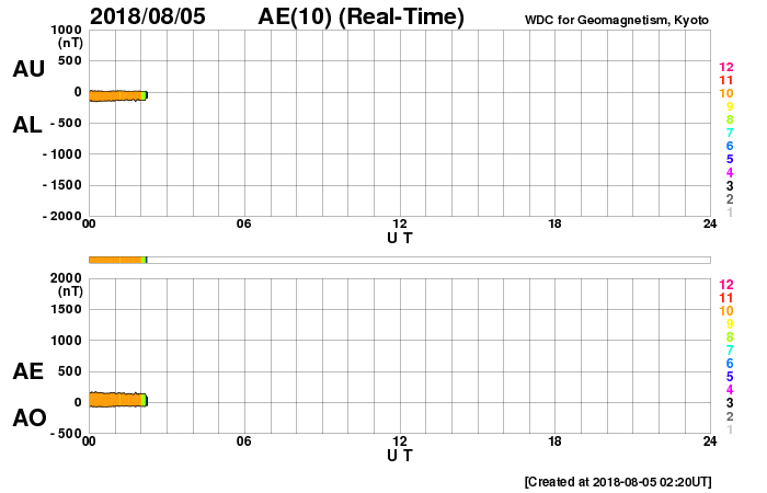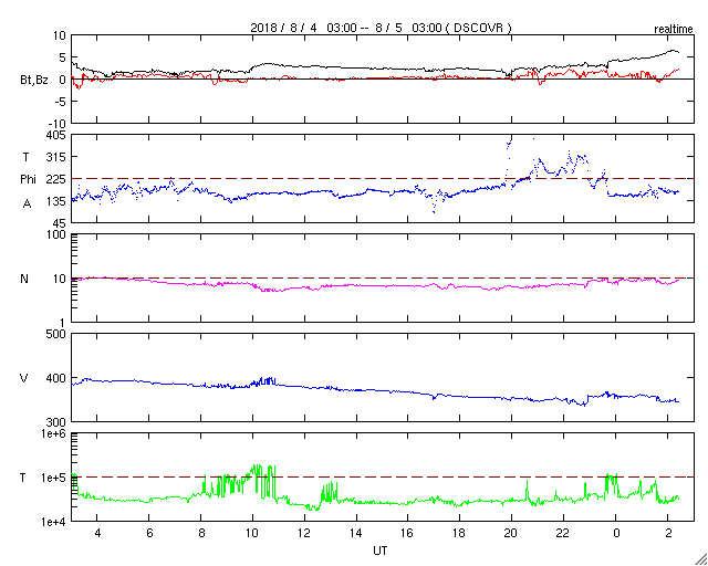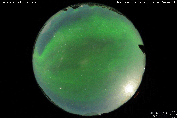 2018/ 8/ 5 11:31 更新 太陽風は低速になり、磁気圏も穏やかです。 担当 篠原 太陽風は、速度が380km/秒から350km/秒に下がり、 より低速の風になっています。 磁場強度は、昨日のニュース以降、 2〜3nTと弱い状態に変わっていましたが、 グラフの最後で、5nTと平均的な値に戻る変化が見えています。 磁場の南北成分は、0nT付近で小さく変化するだけで、 磁気圏は全体としては穏やかに推移しています。 4日11時(世界時4日2時)過ぎに、 昭和基地の全天カメラで撮影されたオーロラの様子を紹介します。 今日の太陽風のグラフの少し前に起きた、 太陽風磁場の南向きの変化に関係する、小規模の活動で、 AE指数のグラフは、少しだけ盛り上がっている程度です。 今後、昨日紹介した様に、 小さいコロナホールの影響がいくらか見られるか、 それがなければ、低速の穏やかな太陽風が続きそうです。 太陽は、東端から現れた活動的な領域には、 白斑が見えるだけで、黒点はありません。 太陽は無黒点が続いています。