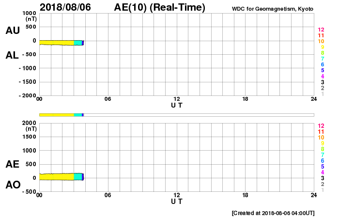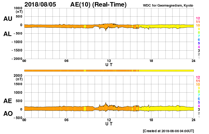 下段のAEグラフの値が高くなると、オーロラ活動が活発化しています。