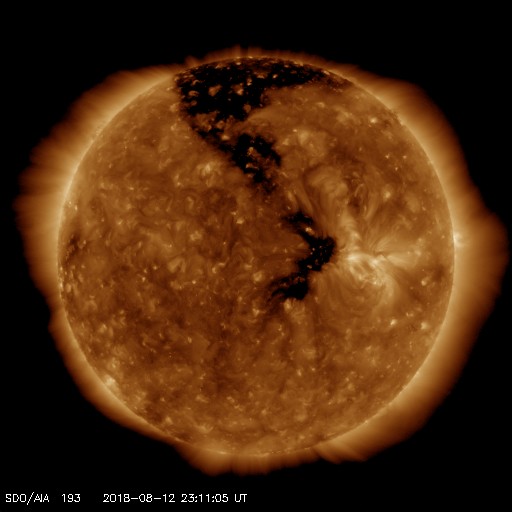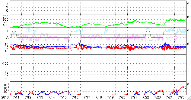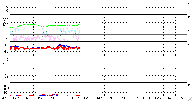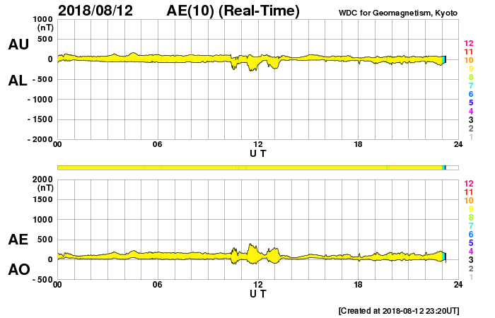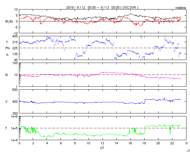 2018/ 8/13 08:26 更新 太陽風は平均的な速度で安定しています。太陽は無黒点です。 担当 篠原 太陽風の速度は、 昨日の昼頃に400km/秒から380km/秒に少し下がり、 今日の未明に、420km/秒へ急に高まる変化が到来して、 現在は再び400km/秒へ近付いています。 変化はいずれも小幅で、太陽風は平均的な速度で推移しています。 太陽風の磁場強度は、3nTとやや弱くなっています。 南北成分は、小幅ですが南北に変化していて、 磁気圏では小さい活動も起きている様です。 オーロラの活動度を示すAE指数のグラフは、 所々で小さく変化しています。 SDO衛星AIA193の太陽コロナ写真では、 北極から赤道域へ伸びるコロナホールの先頭は、 太陽の西半球へ進んでいます。 明後日くらいから、太陽風に影響が見られそうです。 太陽は無黒点です。 X線グラフも変化はなく、太陽は穏やかな状態が続いています。 ![]() SDO衛星のAIA193カメラによる太陽コロナの様子 (c) SDO (NASA) ![]() SDO衛星による太陽の可視光写真 (c) SDO (NASA) ![]() DSCOVRが観測した太陽風の磁場(1番上の枠、黒線は全体の強度、赤線は南北成分) および、太陽風の密度(3番目の紫線)、速度(4番目の青線) (c) データ:NOAA/SWPC、作図:宇宙天気ニュース ![]() AE指数(速報値) 下段のAEグラフの値が高くなると、オーロラ活動が活発化しています。 (c) 京都大学WDC ![]() 27日の太陽周期に合わせたデータプロット 太陽が同じ面を地球に向けていた27日前の変化から、今後を予想することができます。 (c) 作図:宇宙天気ニュース