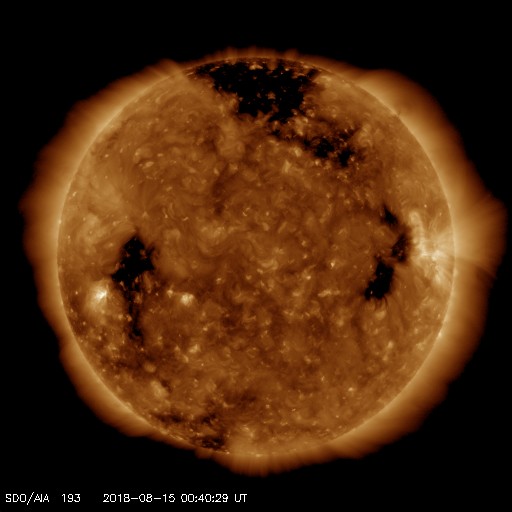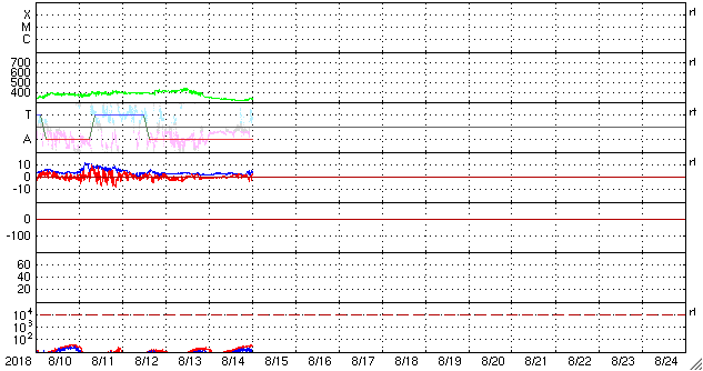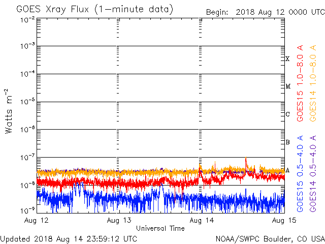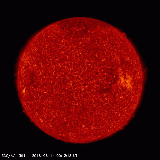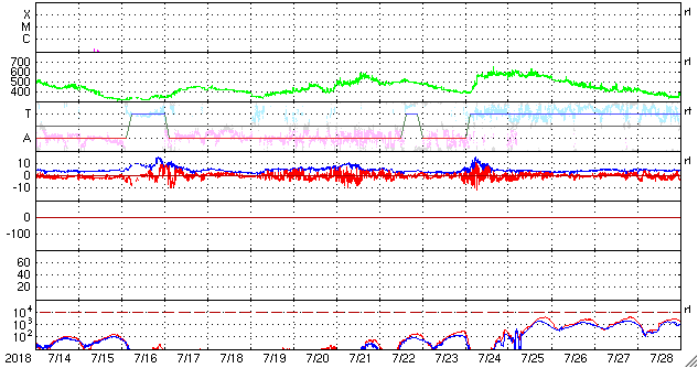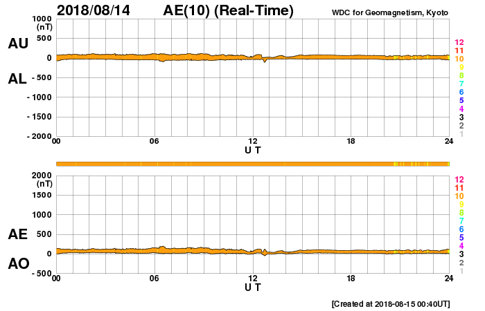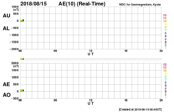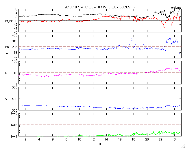 2018/ 8/15 09:51 更新 新しい黒点は2718群となりました。太陽風は低速ですが、これから高まる可能性があります。 担当 篠原 太陽の東側(左側)に発生した黒点は、 2718黒点群と番号が付けられています。 昨日よりも大きくなって、より見やすくなっています。 X線グラフには小さい変化が見えていますが、 SDO衛星AIAカメラを見ると、 2718群は、特に活動的という様子ではありません。 また、太陽の北西側(右上)で、 昨日の昼、14日13時(世界時14日4時)頃から、 フィラメント噴出が発生しています。 SDO衛星AIA304の動画を掲載します。 黒いガスの筋が噴き上がっていく様子が見えます。 太陽の端近くで発生しているので、 地球への影響はないように思います。 太陽風は、昨夜遅くにかけて速度が320km/秒へ下がり、 更に低速の風になりました。 今朝くらいから少しだけ上がって、現在は330km/秒です。 一方、磁場強度は、2nTと弱い状態が続いていましたが、 今朝、15日6時(世界時14日21時)から、 4〜5nTに少し上がっています。 平均的な値に戻った程度の変化ですが、 コロナホールの影響が及び始めているのかもしれません。 今後、更に磁場強度が強まったり、 速度も上昇を始める可能性があります。 引き続き、太陽風の変化に注目してください。 磁気圏は穏やかな状態が続いています。 オーロラの活動度を示すAE指数のグラフは、 ほとんど変化は見られません。 SDO衛星AIA193の太陽写真では、 東側(左側)の赤道域に新しいコロナホールが見えています。 5日後くらいからこちらの影響に注目です。