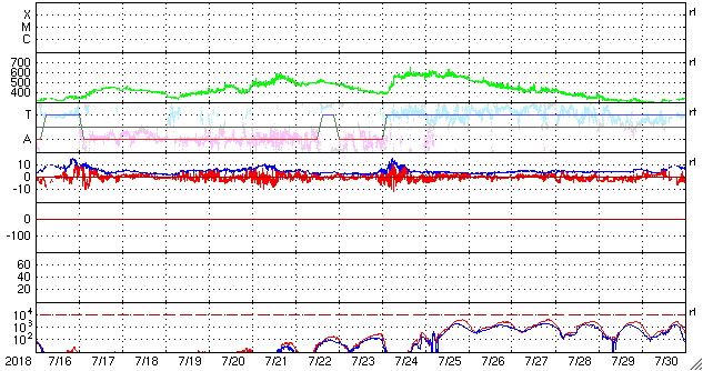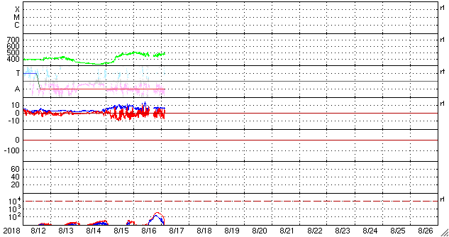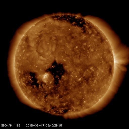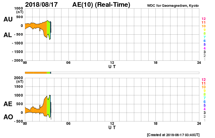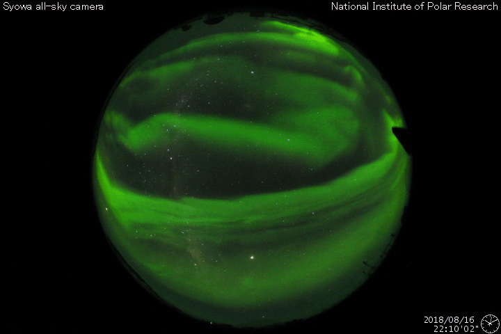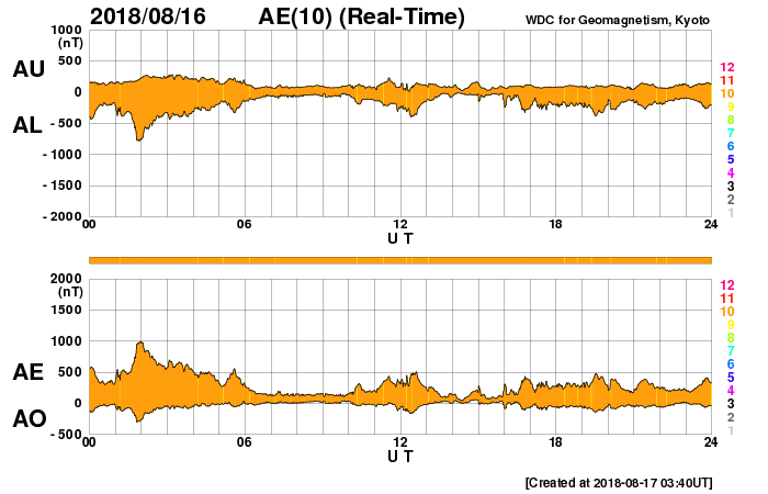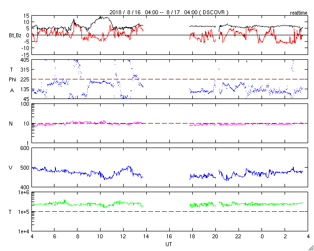 2018/ 8/17 12:47 更新 太陽風速度の高まりは続き、磁気圏も活動的です。 担当 篠原 太陽風の速度は、 昨夜にかけて500km/秒から450km/秒へ下がりましたが、 今朝くらいから少し上がって、現在は480km/秒です。 太陽風速度の高まりは続いています。 太陽風の磁場強度は、 一時的に13nTに強まる変化も起きていますが、 全体としては、5〜6nTと平均的な状態で推移しています。 南北成分の南寄りの傾向は続いていて、 グラフの後半では、-5nTと南向きにやや強まっています。 磁気圏は活動的な状態が続き、 AE指数は300〜500nTの小規模の活動が続き、 最初と最後に1000nTの大きな変化も起きています。 昨日に続き、南極の昭和基地のオーロラを掲載します。 世界時16日22時過ぎの活動です。 AE指数では特に高まりは起きていませんでした。 SDO衛星AIA193の太陽写真では、 次のコロナホールが太陽の中心線に達しています。 3日後くらいからは、こちらの影響が始まりそうです。 太陽は、2718黒点群が今日も見えています。 A8.9と、Bクラスに届かない小さいフレアを起こした程度です。 ![]() 南極・昭和基地の全天カメラで、世界時16日22時過ぎに撮影されたオーロラ。 (c) 国立極地研究所、(動画加工 : 宇宙天気ニュース) ![]() SDO衛星のAIA193カメラによる太陽コロナの様子 (c) SDO (NASA) ![]() SDO衛星による太陽の可視光写真。マウスの矢印を写真に重ねると、黒点番号付きの写真に切り替わります。 (c) SDO (NASA) ![]() DSCOVRが観測した太陽風の磁場(1番上の枠、黒線は全体の強度、赤線は南北成分) および、太陽風の密度(3番目の紫線)、速度(4番目の青線) (c) データ:NOAA/SWPC、作図:宇宙天気ニュース ![]() AE指数(速報値) 下段のAEグラフの値が高くなると、オーロラ活動が活発化しています。 (c) 京都大学WDC ![]() ![]() 27日の太陽周期に合わせたデータプロット 太陽が同じ面を地球に向けていた27日前の変化から、今後を予想することができます。 (c) 作図:宇宙天気ニュース