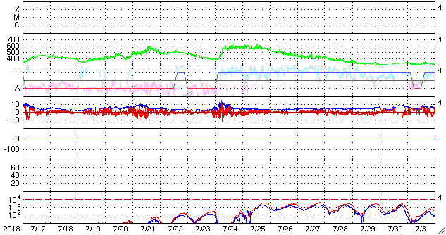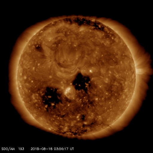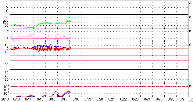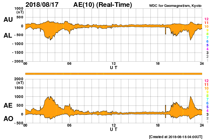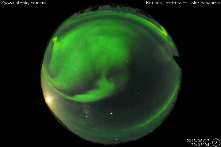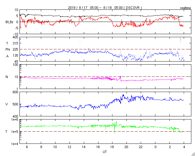 2018/ 8/18 13:02 更新 太陽風の速度は550km/秒に高まり、高速風は続いています。 担当 篠原 太陽風の速度は、 今日未明の18日2時(性愛時17日17時)から更に高まり、 一時的に、550km/秒に達しています。 現在は少し下がって、530lkm/秒です。 磁場強度は、5nTで安定しています。 南北成分は、南に向いたり、北に向いたり、 ゆっくりと変化しています。 この中で、南に振れた時間帯に磁気圏の活動が高まっていて、 AE指数は、500〜1000nTの中規模の活動が 時間をおいて発生しています。 後半の1000nTに達した頃のオーロラの様子を、 昭和基地の全天カメラの動画で紹介します。 3日連続の掲載ですが、今日の動画は一段と見事です。 SDO衛星AIA193では、 コロナホールが西の端に達して、 太陽風の速度は下がるかと思ったのですが、 高速風の勢いは増しています。 この高まりはどこまで続くでしょうか。 一方、次のコロナホールは太陽の中央部を通過しつつあります。 2日後くらいからはこちらの影響に切り替わりそうです。 太陽は、2718黒点群がぽつんと見えています。 この領域で、Aクラスのとても小さいフレアが発生しています。 ![]() 南極・昭和基地の全天カメラで、世界時17日22時過ぎに撮影されたオーロラ。 (c) 国立極地研究所、(動画加工 : 宇宙天気ニュース) ![]() SDO衛星のAIA193カメラによる太陽コロナの様子 (c) SDO (NASA) ![]() SDO衛星による太陽の可視光写真。マウスの矢印を写真に重ねると、黒点番号付きの写真に切り替わります。 (c) SDO (NASA) ![]() DSCOVRが観測した太陽風の磁場(1番上の枠、黒線は全体の強度、赤線は南北成分) および、太陽風の密度(3番目の紫線)、速度(4番目の青線) (c) データ:NOAA/SWPC、作図:宇宙天気ニュース ![]() AE指数(速報値) 下段のAEグラフの値が高くなると、オーロラ活動が活発化しています。 (c) 京都大学WDC ![]() ![]() 27日の太陽周期に合わせたデータプロット 太陽が同じ面を地球に向けていた27日前の変化から、今後を予想することができます。 (c) 作図:宇宙天気ニュース