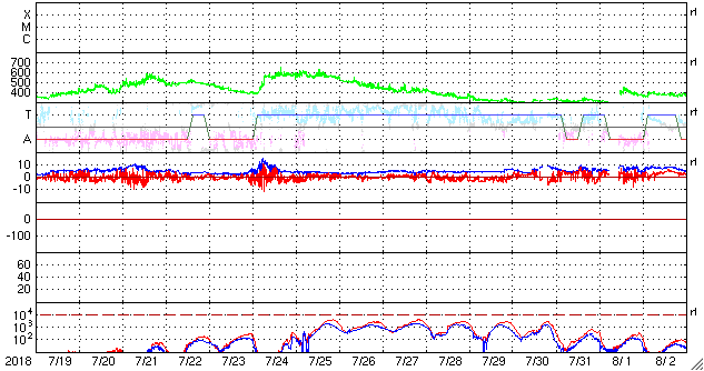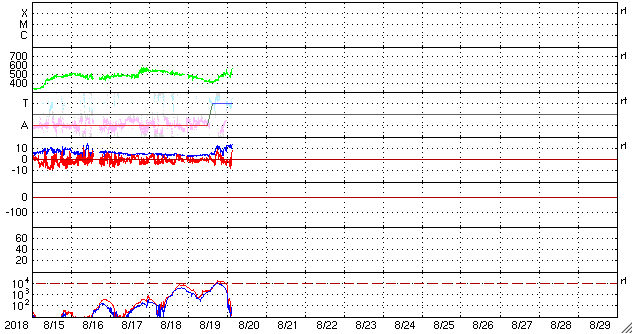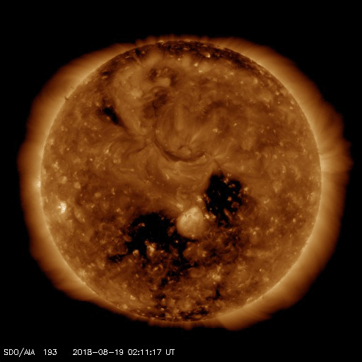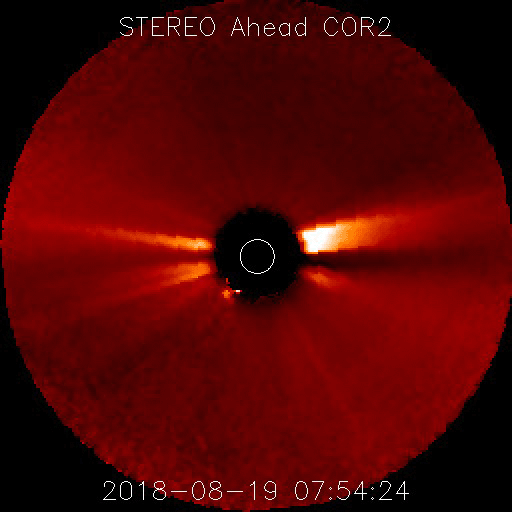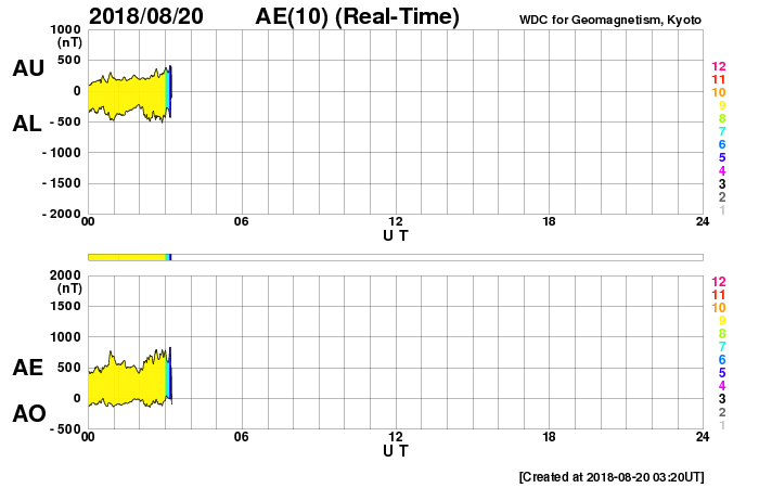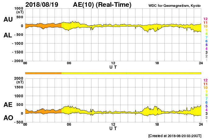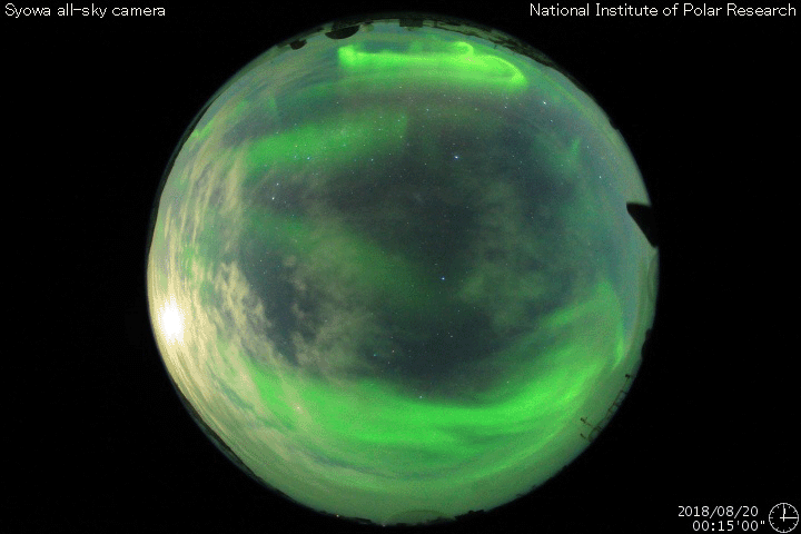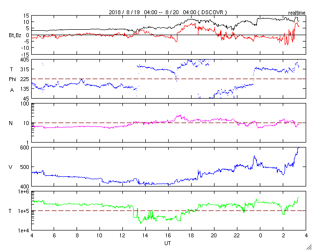 2018/ 8/20 12:39 更新 次の高速太陽風が到来し、550km/秒に速度が高まっています。 担当 篠原 太陽風の速度は、 昨夜にかけて400km/秒近くまで下がりましたが、 その後再び上昇を始め、今朝の段階で500km/秒に達し、 現在は550km/秒に上がりかけています。 次のコロナホールの影響が始まった様です。 太陽風の磁場強度も同じ様に強まっていて、 今日に入ってから、10〜13nTで推移しています。 この様子から考えると、 太陽風の速度は更に高まるかもしれません。 磁場の南北成分は、北向きには強まる変化をしていますが、 南向きにはあまり強まっていません。 このため、磁気圏の活動は活発になっていますが、 変化としては、AE指数で500〜800nTと 中規模の変化に留まっています。 今後、磁場が南向きに大きく変化すると、 AE指数のグラフも大きく変化するようになるでしょう。 この中で、AE指数の20日のグラフの最初の高まりにあたる、 世界時20日0時半頃のオーロラの様子を 昭和基地の全天カメラの動画で紹介します。 オーロラの光が全天を飾っています。 SDO衛星AIA193では、 南半球の中緯度域にかけてコロナホールが広がっています。 この領域の影響も地球にやって来ると考えると、 今後、5日程度は高速の太陽風が続くかもしれません。 太陽では、2718黒点群は見えなくなり、 新しく現れた黒点に2719群と番号が付いています。 消えてしまった2718群の領域で、 20日15時(世界時20日6時)に小さいフレアが発生しています。 SDO衛星AIA193による動画を掲載します。 この爆発に伴って、CME(太陽ガスの放出現象)が発生した様で、 太陽を横から見ているSTEREO Ahead衛星のCOR2カメラで、 コロナのガスが飛び出す様子が撮影されています。 ガスは、地球のある右方向に向かっていて、 3日後くらいに地球に変化をもたらす可能性があります。