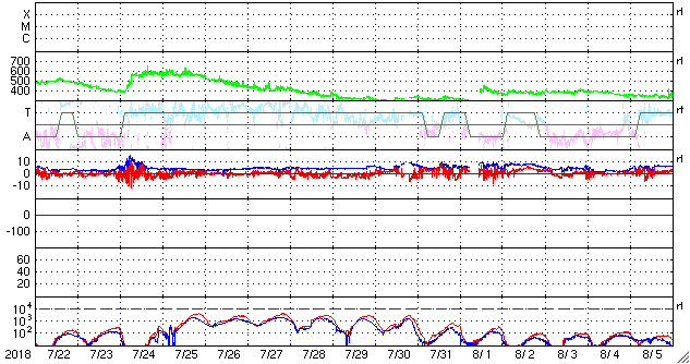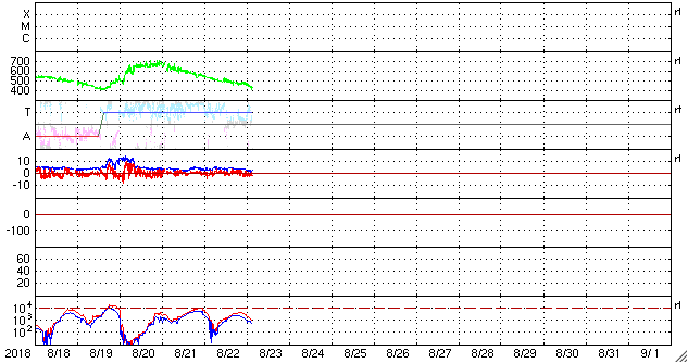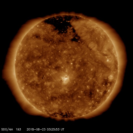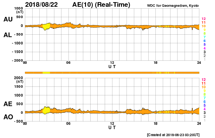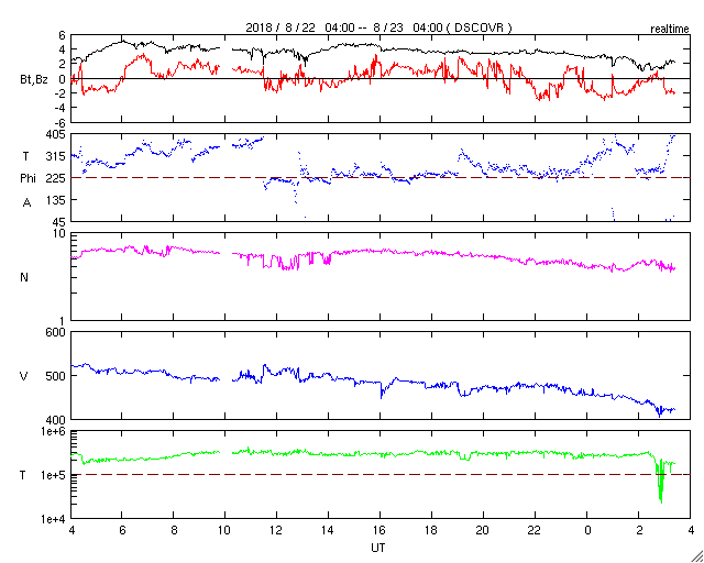 2018/ 8/23 12:38 更新 太陽風の速度は下がり、平均的な速さに戻りました。 担当 篠原 太陽風の速度は、昨夜遅くに500km/秒台を割り、 更に低下して、現在は420km/秒と平均的な速さに戻っています。 太陽風速度の高まりは、前周期と同様に、 3日程度で終わりを迎えた様です。 太陽風の磁場強度は、4nT前後で推移しています。 掲載のグラフの中では、やや下がっていく傾向が見られます。 AE指数は、200〜300nTの小さい変化が続いているくらいで、 磁気圏も概ね静穏となっています。 SDO衛星AIA193では、 北半球の高緯度域にコロナホールが見えています。 前周期よりやや広がっていて、 今後の太陽風に弱い影響が見られるかもしれません。 太陽は、2719群の場所に小さい黒点が見えています。 X線グラフに変化はなく、太陽は穏やかです。 ![]() SDO衛星のAIA193カメラによる太陽コロナの様子 (c) SDO (NASA) ![]() SDO衛星による太陽の可視光写真。マウスの矢印を写真に重ねると、黒点番号付きの写真に切り替わります。 (c) SDO (NASA) ![]() DSCOVRが観測した太陽風の磁場(1番上の枠、黒線は全体の強度、赤線は南北成分) および、太陽風の密度(3番目の紫線)、速度(4番目の青線) (c) データ:NOAA/SWPC、作図:宇宙天気ニュース ![]() AE指数(速報値) 下段のAEグラフの値が高くなると、オーロラ活動が活発化しています。 (c) 京都大学WDC ![]() ![]() 27日の太陽周期に合わせたデータプロット 太陽が同じ面を地球に向けていた27日前の変化から、今後を予想することができます。 (c) 作図:宇宙天気ニュース