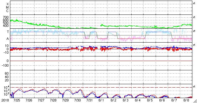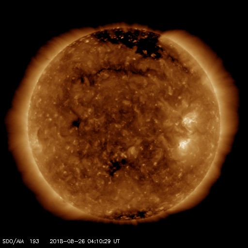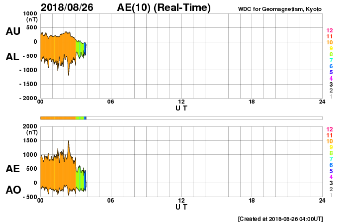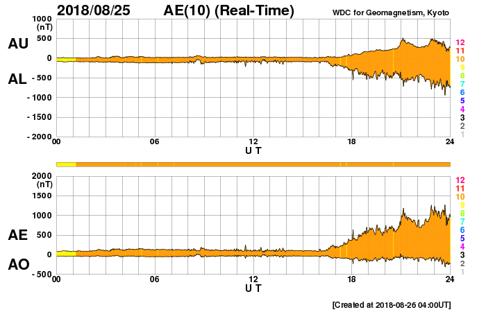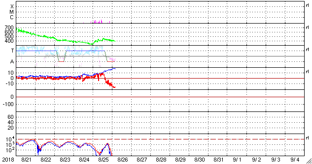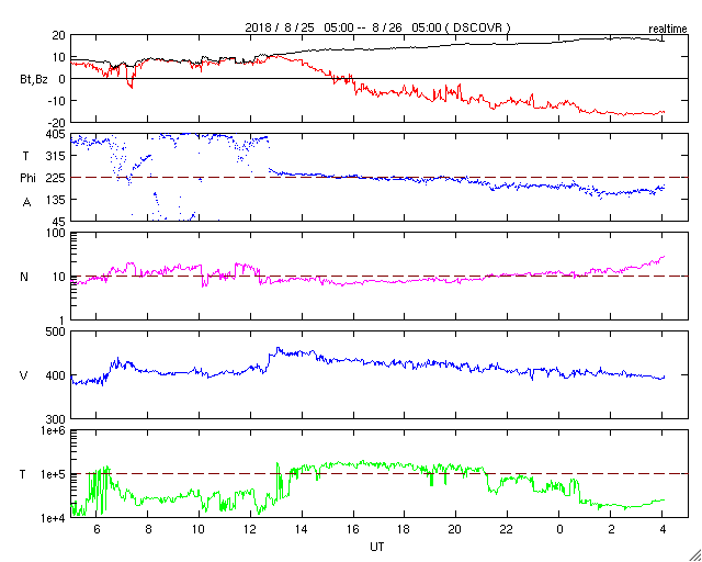 2018/ 8/26 13:20 更新 太陽風の乱れが到来し、磁場が南向きに強まって磁気圏の活動を強めています。 担当 篠原 一昨日、24日のニュースで紹介した、 20日に発生したCMEによる太陽風の乱れが到来し、 磁場が大きく南向きに変化して、磁気圏の活動を強めています。 DSCOVR衛星の観測によると、 昨日のニュースの後も、 太陽風の速度は400km/秒、磁場強度は7nT付近で安定していました。 その後、25日21時(世界時25日12時)になると、 磁場強度が更に強まり始め、半日ほどかけて18nTに達し、 現在もこの状態が続いています。 太陽風の速度は、一旦、450km/秒に高まりましたが、 2時間ほど経つとゆっくりと下がり始め、 現在は400km/秒と平均的な状態に戻っています。 磁気圏への影響を決める磁場の南北方向の変化は、 磁場が強まり始めた頃は北向きでしたが、 次第に南向きに切り替わり、 今朝、26日5時(世界時25日20時)頃から、 -10nTを超えて大きく振れる様になり、 現在は -16nTに達しています。 このため、磁気圏の活動は一気に高まって、 AE指数は、1000nTに達する大きな変化が6時間ほど続いています。 磁気嵐も強まっていて、Dst指数の速報値は -136nTに達しています。 (Dst指数は、マイナス側に発達します) Dst指数が -100nTに達したのは、2017年9月8日以来で、 およそ1年ぶりです。 CMEの原因となったフィラメント噴出は 20日17時(世界時20日8時)頃に始まりました。 そこから計算すると、乱れの到来まで5日ほどかかっています。 磁場強度の上昇は止まっているので、 太陽風の乱れは後半に入っている可能性があります。 今後、次第に磁場強度が下がると、 それと共に南向きの変化も小さくなるか、 あるいは、その前に北向きに反転する変化が見られるかもしれません。 引き続き太陽風、磁気圏活動の推移に注目してください。 太陽は、2720黒点群は昨日と同じくらいの大きさに見えています。 Bクラスの小さいフレアを繰り返し起こしています。 一方、2719黒点群は小さくなり、 掲載の可視光写真では、かろうじて見える程度です。