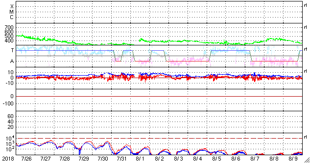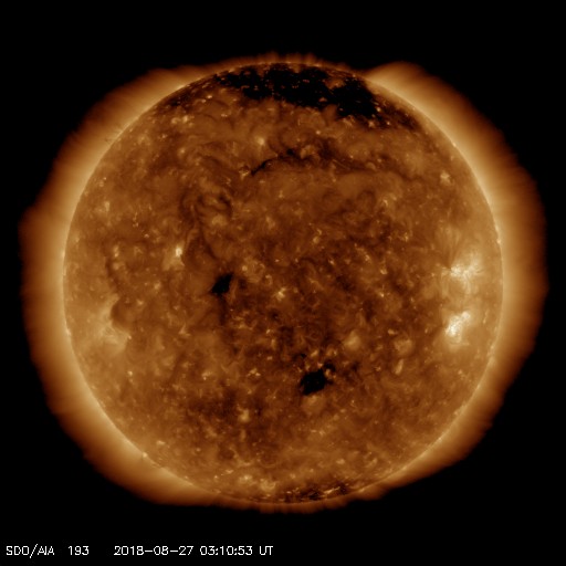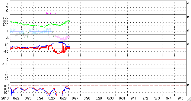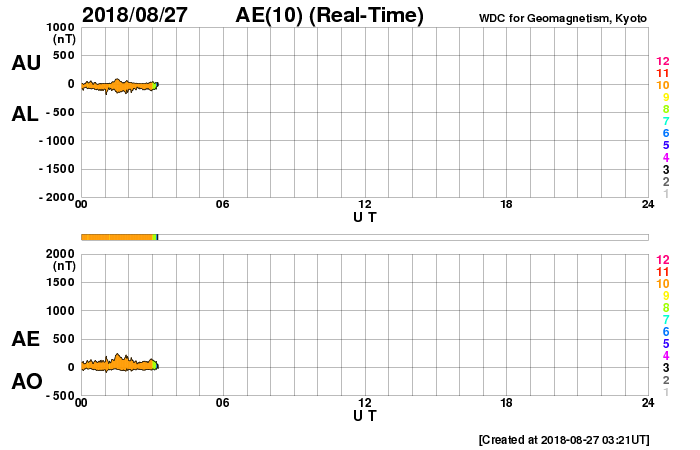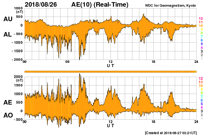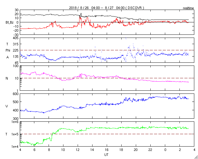 2018/ 8/27 12:31 更新 太陽風磁場強度の強まりは終わりましたが、速度が上昇して高速太陽風になっています。 担当 篠原 太陽風の磁場強度の強まりは、今朝早くまで続きました。 27日3時(世界時26日18時)頃に10nTを割って、 その後、5nTと平均的な値に戻っています。 磁場の南北成分も、時々、北向きに振れる時間もありましたが、 全体としては南寄りに推移して、 -10nTを超える強い南向きが今日の未明まで続きました。 このため、磁気圏では激しい活動が続き、 AE指数のグラフは、1000nTを超える大きな変化が連続的に発生し、 最大では、2000nTを超える変化になっています。 Dst指数(速報値)も、昨日よりも更に下がって、 -169nTに達する変化となっています (Dst指数はマイナス方向に強まります)。 Dst指数が -150nTを超えて強まったのは、 2015年12月20日以来です。 磁場強度が下がった後は、 磁場の南北成分は、弱い北寄りになっていて、 磁気圏の活動もほとんど見られなくなっています。 一方、太陽風の速度は、昨夕くらいから次第に上昇を始め、 今日の未明には500km/秒を超えて高速風に変わっています。 現在も550km/秒前後で推移しています。 速度の高まりは、CMEによるものではなく、 SDO衛星AIA193の太陽コロナ写真で、 北半球の高緯度域に見えていたコロナホールの影響かもしれません。 緯度が高めだったのですが、 しっかりとした高速風をもたらしています。 27日周期の図では、 前周期の今頃は穏やかな太陽風が続いていたのですが、 随分と変化しています。 この高速太陽風はどこまで続くでしょうか。 太陽では、2つの黒点群が残っていますが、 南の2719群はとても小さくなって、かろうじて見える程度です。 北の2720群も小さくなり始めていて、 X線グラフは変化が見られなくなっています。 ![]() Dst指数の速報値は、最大で -169nTに達しています(マイナス方向に強まります)。大きな磁気嵐が発生しています。 (c) 京都大学WDC ![]() SDO衛星のAIA193カメラによる太陽コロナの様子 (c) SDO (NASA) ![]() SDO衛星による太陽の可視光写真。マウスの矢印を写真に重ねると、黒点番号付きの写真に切り替わります。 (c) SDO (NASA) ![]() DSCOVRが観測した太陽風の磁場(1番上の枠、黒線は全体の強度、赤線は南北成分) および、太陽風の密度(3番目の紫線)、速度(4番目の青線) (c) データ:NOAA/SWPC、作図:宇宙天気ニュース ![]() AE指数(速報値) 下段のAEグラフの値が高くなると、オーロラ活動が活発化しています。 (c) 京都大学WDC ![]() ![]() 27日の太陽周期に合わせたデータプロット 太陽が同じ面を地球に向けていた27日前の変化から、今後を予想することができます。 (c) 作図:宇宙天気ニュース
