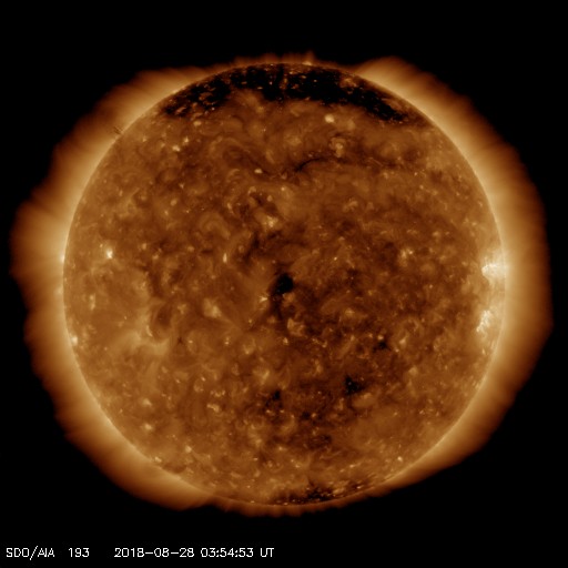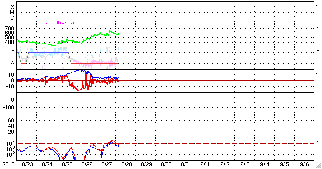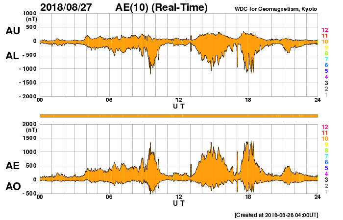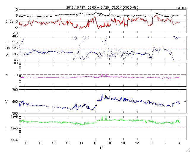 2018/ 8/28 13:11 更新 太陽風の速度は630km/秒に高まりました。ムルマンスクのオーロラをどうぞ。 担当 篠原 ロシア・ムルマンスクの福島留美さんより、 8月26日夜にムルマンスクで、 L・トリフォノワさんにより撮影された オーロラの写真をいただきました。 太陽風磁場の強まりの後半の頃に撮影された様です。 頭上からオーロラの光が、降り注ぐ様に輝いています。 左下に明るく見えるのは、満月です。 空や雲を照らして、写真を独特の雰囲気にしています。 右端の真ん中の少し上寄りに、こと座のベガが見えています。 その左側、写真の中心近くに、はくちょう座のデネブ、 この2つの星から三角形を作って下に伸ばすと、 わし座のアルタイルも見えています。 この夏の大三角の広がりと見比べると、 オーロラの空全体への広がりも実感できるように思います。 この夜は、ムルマンスクだけでなく、 ロシア各地でオーロラが観測されたそうです。 まだ夏の後半で、空が暗くなるのは限られた時間の様です。 素晴らしい写真をありがとうございます。 太陽風は、今日の未明に更に高まって、 540km/秒から630km/秒に上がりました。 その後、550km/秒近くまで下がりましたが、 グラフの最後で600km/秒に上がっています。 高速風領域はなかなかの規模になっています。 太陽風の磁場強度は、5nT付近で安定しています。 南北成分は北を向いたり、南を向いたりしていて、 速度が高まっているため、 磁気圏の活動は強まった状態が続いています。 AE指数のグラフは、 1300nTに達する大きな変化が3回発生しています。 速度の高まりは続いているため、 引き続き磁気圏活動の高まりに注目してください。 太陽は、南の2719黒点群は見えなくなり、 北の2720群も小さくなっています。 X線グラフも変化はなく、この後静かに沈んで行きそうです。 放射線帯の高エネルギー電子が増加して、 10,000に達しています。 更に高まるかもしれません。 ![]() 8月26日に、ロシア・ムルマンスク州で撮影されたオーロラ。 (c) 福島留美氏、L・トリフォノワ氏 ![]() SDO衛星のAIA193カメラによる太陽コロナの様子 (c) SDO (NASA) ![]() SDO衛星による太陽の可視光写真。マウスの矢印を写真に重ねると、黒点番号付きの写真に切り替わります。 (c) SDO (NASA) ![]() DSCOVRが観測した太陽風の磁場(1番上の枠、黒線は全体の強度、赤線は南北成分) および、太陽風の密度(3番目の紫線)、速度(4番目の青線) (c) データ:NOAA/SWPC、作図:宇宙天気ニュース ![]() AE指数(速報値) 下段のAEグラフの値が高くなると、オーロラ活動が活発化しています。 (c) 京都大学WDC ![]() ![]() 27日の太陽周期に合わせたデータプロット 太陽が同じ面を地球に向けていた27日前の変化から、今後を予想することができます。 (c) 作図:宇宙天気ニュース