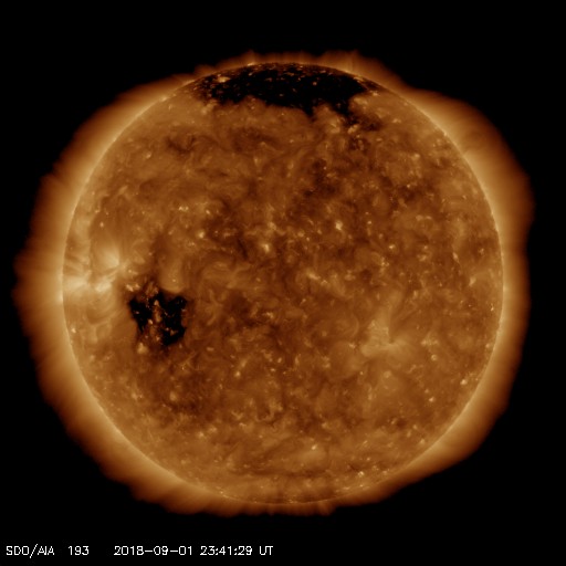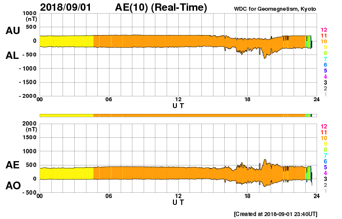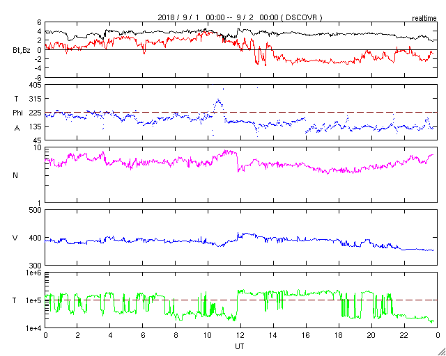 2018/ 9/ 2 08:56 更新 太陽風は低速になっています。磁気圏は穏やかです。 担当 篠原 太陽風の速度は、昨夜までは380km/秒程度で推移していましたが、 現在は少し下がって360km/秒です。 太陽風は低速風になっています。 磁場強度も少し下がって、3nTとやや弱い状態です。 太陽風磁場の南北成分は、 今日のグラフの前半は北向きでしたが、 後半は南向きに傾向が変化しています。 このため、AE指数のグラフの後半に小さい変化が起きています。 太陽風の速度が下がっていることと、 磁場強度も弱くなっているので、 磁気圏の活動は限定的でしょう。 SDO衛星AIA193の太陽コロナ写真では、 太陽の東側(左側)にコロナホールが見えています。 規模はそれほど大きくありませんが、 6日後くらいに太陽風の高まりが来るかもしれません。 太陽は今日も無黒点です。 X線グラフは、全体の強度も下がっています。 放射線帯の高エネルギー電子は、 また少し下がっていますが、 まだ1万を超えた状態を保っています。 高専スペースキャンプは、最終日を迎えました。 昨日は天候不良のため、気球で空に上げる実験は行えず、 屋内でCube Satを動かしました。 今日は、その実験成果の発表会です。 お昼に新居浜を発ち、夜に学校に帰り着く予定です。 ![]() SDO衛星のAIA193カメラによる太陽コロナの様子 (c) SDO (NASA) ![]() SDO衛星による太陽の可視光写真 (c) SDO (NASA) ![]() DSCOVRが観測した太陽風の磁場(1番上の枠、黒線は全体の強度、赤線は南北成分) および、太陽風の密度(3番目の紫線)、速度(4番目の青線) (c) データ:NOAA/SWPC、作図:宇宙天気ニュース ![]() AE指数(速報値) 下段のAEグラフの値が高くなると、オーロラ活動が活発化しています。 (c) 京都大学WDC ![]() 27日の太陽周期に合わせたデータプロット 太陽が同じ面を地球に向けていた27日前の変化から、今後を予想することができます。 (c) 作図:宇宙天気ニュース