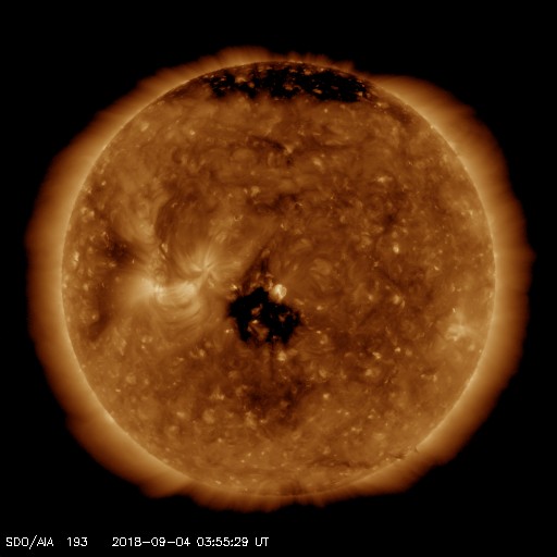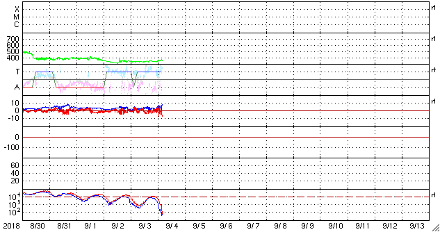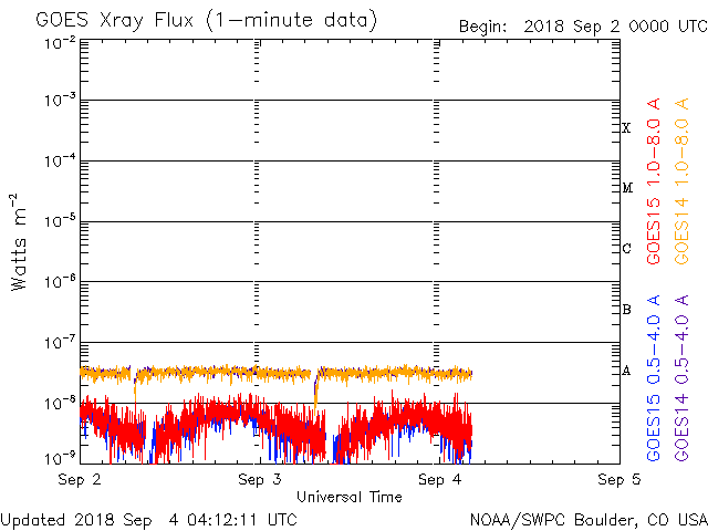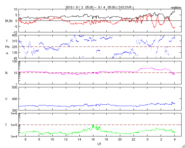 2018/ 9/ 4 13:11 更新 低速の太陽風が続いています。イエローナイフのオーロラをどうぞ。 担当 篠原 高坂雄一さんより、昨日につづいて、 カナダ・イエローナイフで撮影されたオーロラの写真をいただきました。 撮影は、現地3日1時半(世界時3日7時半)頃です。 この夜は夕食後から厚い雲に覆われてしまったそうですが、 雲の切れ間を探して走り回って、 この時間から30分間だけ北の空が見えて、 オーロラを撮影できたそうです。 太陽風は低速の状態が続き、磁場強度も弱く、 厳しい条件は続いていましたが、 少し前から磁場の南北成分が -2〜 -3nTと 弱いながらも南向きに振れていました。 ちょうど良いタイミングで空に晴れ間が見えて、 オーロラの観測に成功したのかもしれません。 1枚目と3枚目の写真の中央には、北斗七星が見えています。 日本からと違い、地平線からずっと離れた空を下方通過しています。 2枚目の写真の中央は北極星です。 こちらでは、上にカシオペヤ、下に北斗七星が写っています。 走り回った成果と言える貴重なオーロラ写真を、 ありがとうございます。 太陽風は、330km/秒から350km/秒に少し速度が上がっていますが、 低速の状態が続いています。 磁場強度は、2〜3nTと弱い状態が続いていましたが、 グラフの最後で5nTを超えるくらいにやや上がっています。 磁場の南北成分は、南を向いたり、北を向いたりしています。 前半は振れ幅は小さかったのですが、 グラフの最後は、 強度が上がったため南北成分の振れ幅もやや大きくなっています。 速度は低速ですが、磁気圏の活動をやや高めているかもしれません。 今日もAE指数のページが停止しているため、 磁気圏の状況を詳しく見ることはできません。 SDO衛星AIA193では、 太陽の中心部のやや南寄りにコロナホールが見えています。 ちょうど今、地球の方向に速度の高い太陽風が流れ出していて、 3日後くらいに地球に到来する可能性があります。 どの程度の変化がやって来るでしょうか。 太陽は無黒点が続いています。 X線グラフも変化はありません。 放射線帯の高エネルギー電子は、 GOES15(赤線)だけが1万に達しましたが、 その後大きく減少する変化が起きています。 明日は両衛星とも1万を割っていそうです。