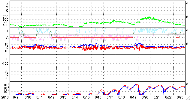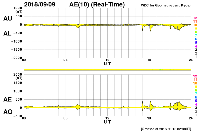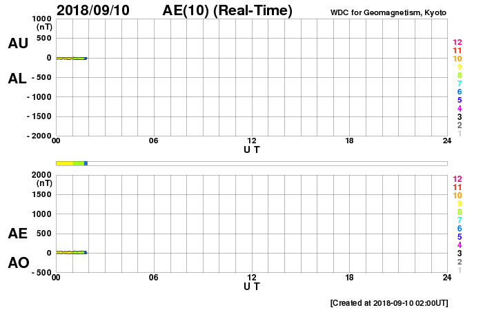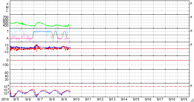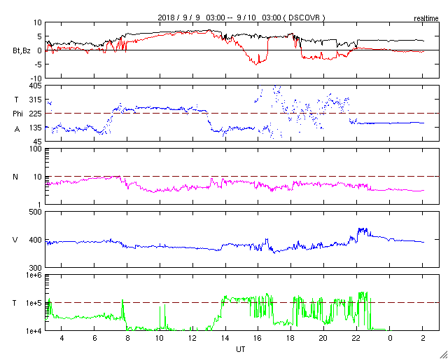 2018/ 9/10 11:16 更新 太陽風は平均的な速度です。2721黒点群は小さくなっています。 担当 篠原 太陽風は、磁場強度が2nTから7nTに上がって、3nTに下がり、 速度は、400km/秒から370km/秒に少し下がって、 400km/秒に戻る小幅の変化をしています。 全体としては、穏やかな太陽風が続いています。 太陽風磁場の南北成分は、磁場がやや強まった頃に、 北に向いたり、南に向いたり、+5〜 -5nT程度の変化をしています。 北向きに振れる時間の方が長かったため、 磁気圏の活動は特に高まってはおらず、 AE指数は400nTの小規模の変化が2回発生している程度です。 SDO衛星AIA193の太陽の西側(右側)に見える コロナホールの影響が近付いていると思われます。 27日周期の図を参考にすると、 太陽風の高まりが3日程度続く可能性があります。 太陽の2721黒点群は、今日は微かになっていて、 この後消えてしまいそうです。 X線グラフも変化はなく、太陽は穏やかです。 今日と明日、研究会に参加するため東京に来ています。 JRの車内で更新しています。