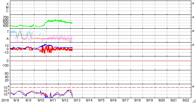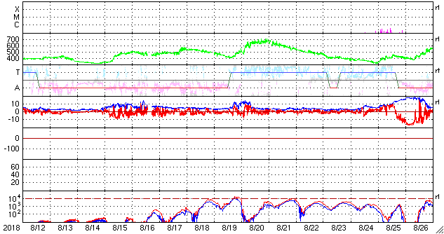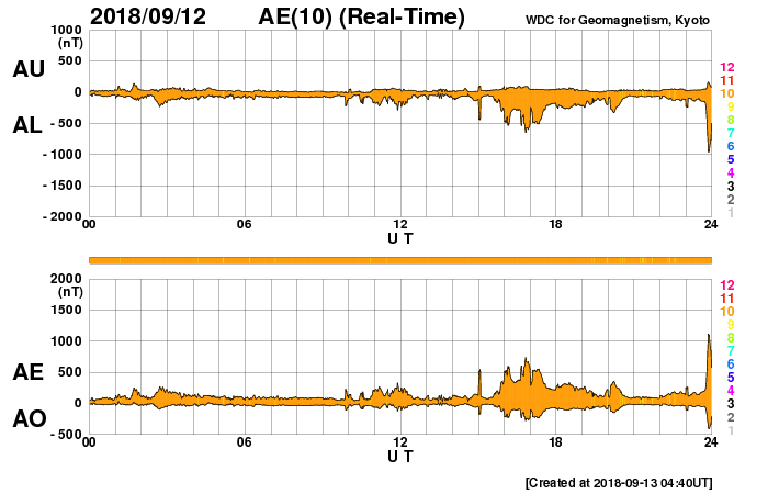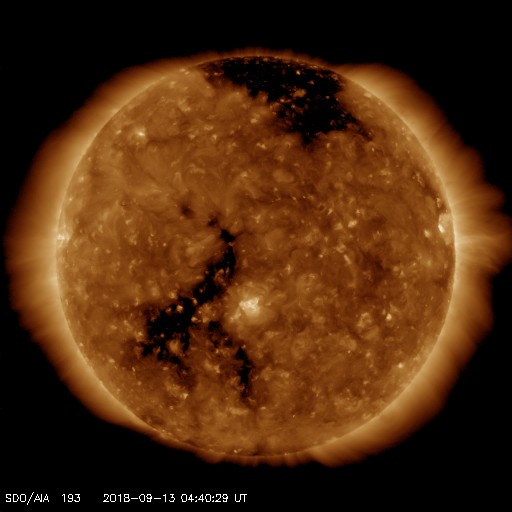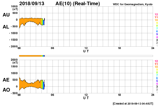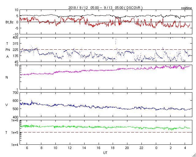 2018/ 9/13 13:53 更新 高速太陽風が続き、磁気圏の活動も続いています。太陽は無黒点です。 担当 篠原 太陽風速度の高まりは現在も続いています。 速さとしては、490km/秒へゆっくりと下がっています。 磁場強度は、5nTと平均的な状態が続いています。 この後、速度は更に下がっていくのか、 27日周期の図の前周期の様に、高まった状態が続くのか、 引き続き注目してください。 太陽風磁場の南北成分は、 グラフの後半にかけて次第に南寄りになっています。 このため、磁気圏の活動も次第に高まっていて、 AE指数は、グラフの後半で、 500nTから1000nTの変化が度々発生しています。 SDO衛星AIA193では、南半球のコロナホールが、 太陽の中心線に達しています。 3日後くらいからは、こちらの影響が始まるでしょう。 太陽は、2722黒点群は見えなくなり、 無黒点になっています。 X線グラフも変化はなく、穏やかです。