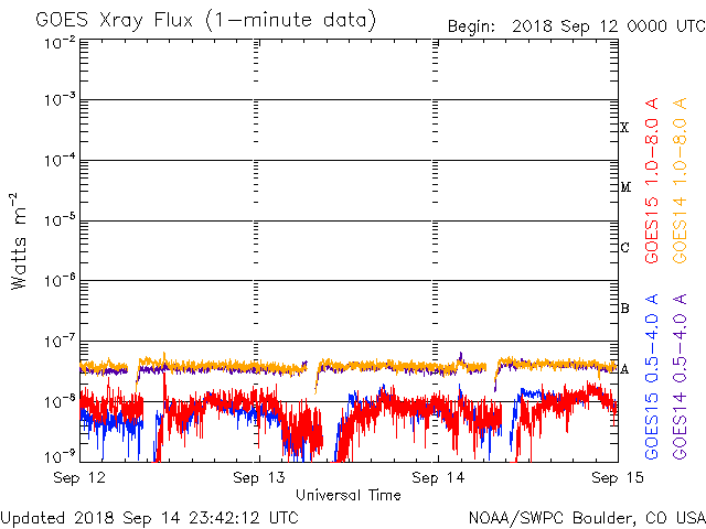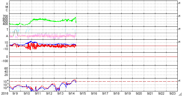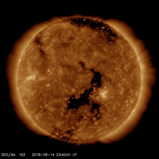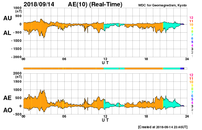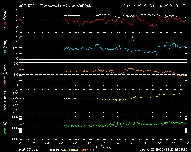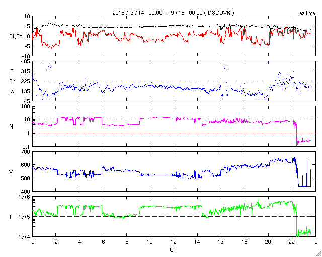 2018/ 9/15 08:49 更新 太陽風の速度は700km/秒近くまで高まっています。 担当 篠原 550km/秒付近と高速だった太陽風の速度は、 今朝に入ると600km/秒を超えて高まり始め、 ACE衛星のデータを参考にすると、 700km/秒近くまで高まっている様です。 磁場強度は、5nTが続いていましたが、 グラフの最後で3nTに下がっています。 速度の高まりは、この辺りでピークを迎えたのかもしれません。 太陽風磁場の南北成分は、 振れ幅はやや小さくなっていますが、南北に変化しています。 速度が高まっているため、磁気圏は活動的な状態が続き、 AE指数のグラフは、大きさはやや小さくなっていますが、 300〜600nTの小・中規模の変化が続いています。 SDO衛星AIA193では、南半球のコロナホールが更に西に進み、 影響の始まる目安の位置に近付いています。 太陽風の高まりは、更に続きそうです。 太陽は無黒点で、穏やかな状態が続いています。 放射線帯の高エネルギー電子が増加しています。 GOES14(青線)、GOES15(赤線)の両方が1万の線を越えて 高まっています。 高速太陽風が続いているので、更に増加する可能性があります。