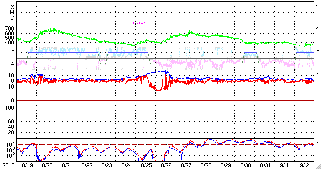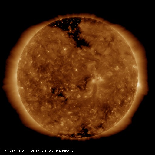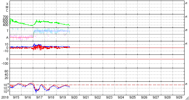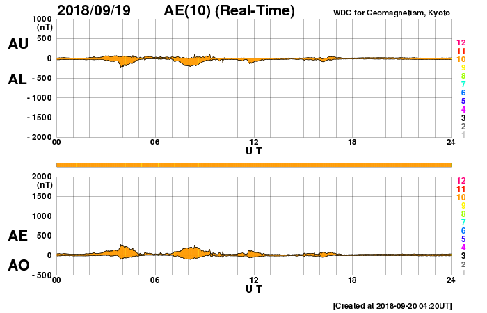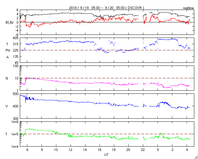 2018/ 9/20 13:38 更新 太陽風はやや低速になり、磁気圏も穏やかです。イエローナイフのオーロラをどうぞ。 担当 篠原 昨日に続いて一週間遅れの紹介になってしまいましたが、 現地9月14〜15日の夜に、 カナダ・イエローナイフで撮影されたオーロラの写真を 高坂雄一さんよりいただきました。 この夜は、厚い雲に覆われていたそうですが、 現地15日0時前から急に星が見え始めて、 頭上でオーロラ爆発とともにピンク色の光が舞ったそうです。 その後、0時40分までに5度の爆発が見られ、 その後、また雲に覆われてしまったそうです。 本当に、鮮やかな色合いのオーロラです。 この日のAE指数を見ると、それまで静かだったグラフが、 現地14日23時半(世界時15日5時半)頃から高まり始めています。 ちょうど良いタイミングで雲が切れた様です。 イエローナイフは通常の秋に比べてとても寒く、 毎晩零下で、雪も毎日パラパラと舞っているそうです。 厳しい条件下での素晴らしい写真をありがとうございます。 現在の太陽風の速度は、 380km/秒とやや低速程度に下がっています。 磁場強度も、2〜4nTとやや弱くなっています。 太陽風磁場の南北成分は、0nT付近か北寄りで推移しています。 このため、磁気圏は穏やかになっていて、 AE指数はほとんど変化が見られません。 太陽風は穏やかになり、 次の注目は、SDO衛星AIA193の太陽の北半球に見える コロナホールの影響です。 2日後くらいから始まりそうです。 太陽は穏やかな状態が続いています。 SDO衛星の可視光写真によると、 太陽の中央部に小さい黒点が現れて すぐ消えるという変化が起きていた様です。 現在は無黒点です。