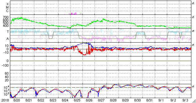 磁場強度も、3nTとやや弱い状態です。