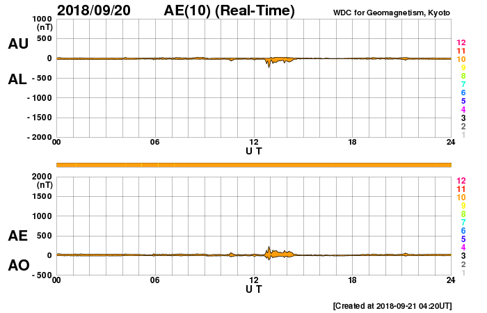 下段のAEグラフの値が高くなると、オーロラ活動が活発化しています。