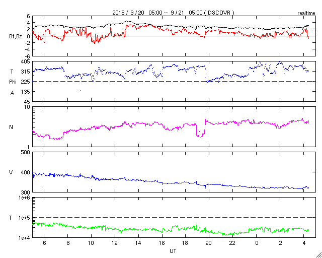 2018/ 9/20 13:38 太陽風はやや低速になり、磁気圏も穏やかです。イエローナイフのオーロラをどうぞ。