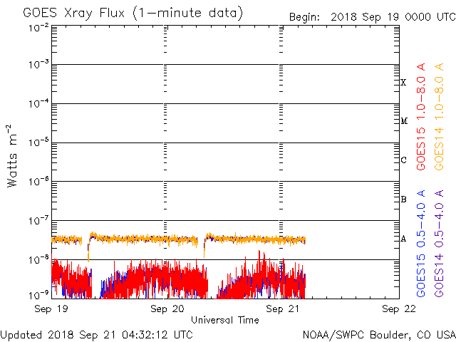 2018/ 9/16 12:56 太陽風の速度は450km/秒に下がっています。次のコロナホールの影響が始まりそうです。