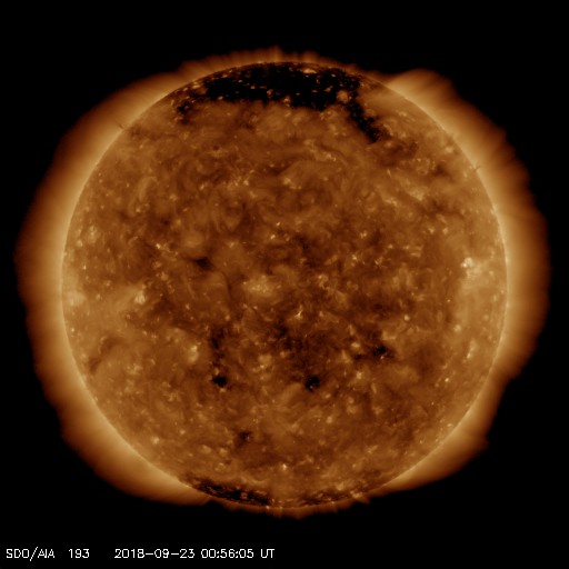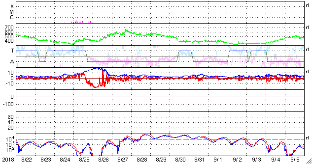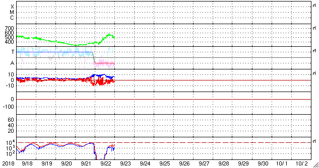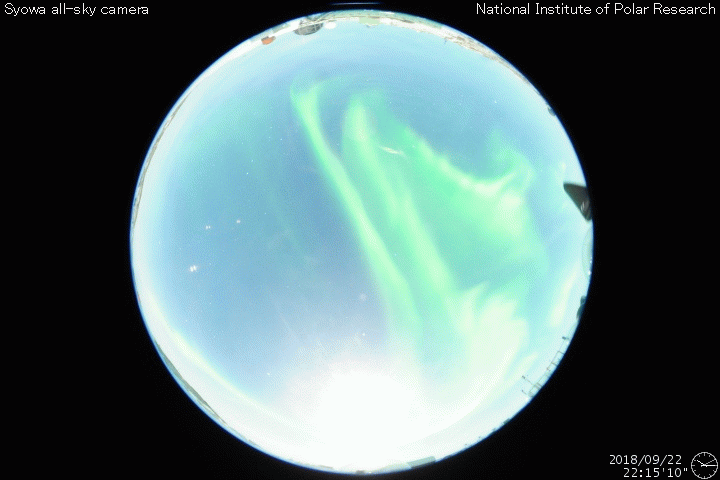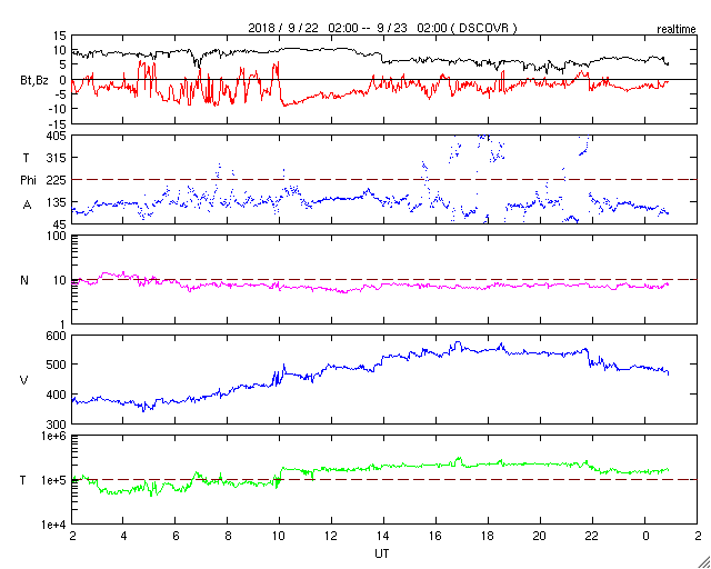 2018/ 9/23 10:08 更新 太陽風の速度は550km/秒まで高まり、磁気圏も活動的です。 担当 篠原 太陽風の速度は、昨夕、22日17時(世界時22日8時)から 400km/秒を超えて高まり始め、 23日0時(世界時22日15時)頃に、550km/秒に達しました。 今朝、23日7時(世界時22日22時)に一段下がって、 以降は480km/秒程度となっていますが、 高速の太陽風が続いています。 太陽風の磁場強度は、10nTから少し下がって、 5〜7nTで推移しています。 速度の高まりが一段落していますが、 磁場強度がまだ弱くなっていないので、 再び速度が上昇するなどの変化が見られるかもしれません。 27日周期の図で前周期の太陽風を見ると、 高速風は4日間ほど続いています。 このことからも、今後の推移に注目してください。 太陽風磁場の南北成分は、南寄りの傾向が続いています。 磁場強度が下がったため、振れ幅は小さくなっていますが、 速度は高まっているので、 磁気圏の活動度は高まった状態が続いていると思われます。 今日は南半球、世界時22日22時半の南極・昭和基地の 全天カメラの動画を紹介します。 満月少し前の明るい月で空が照らされていますが、 その中をオーロラの光が激しく動いています。 太陽は無黒点です。 穏やかな状態が続いています。