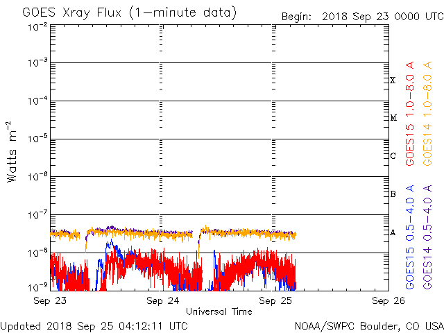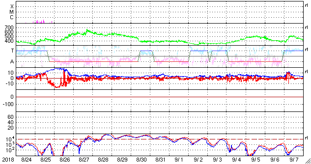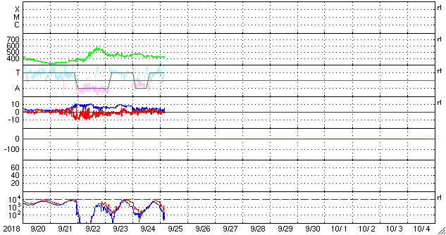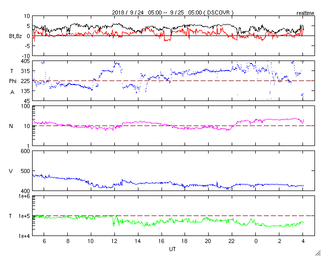 - 2018/ 9/24 10:06 太陽風はやや高速程度に下がり、磁気圏の活動も弱くなっています。