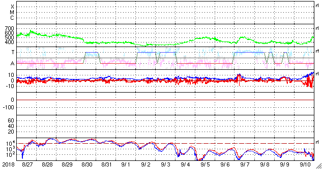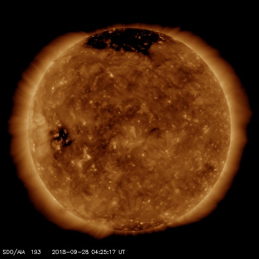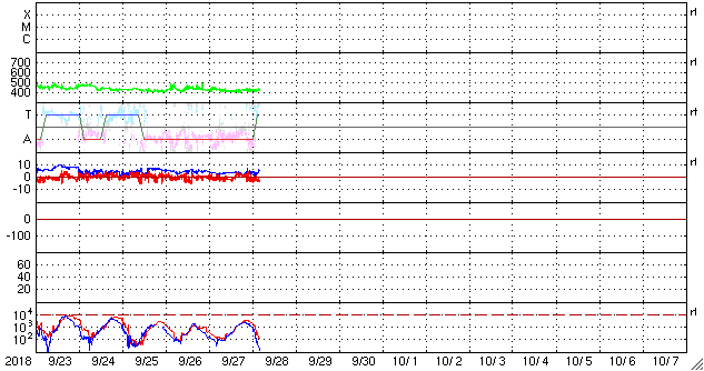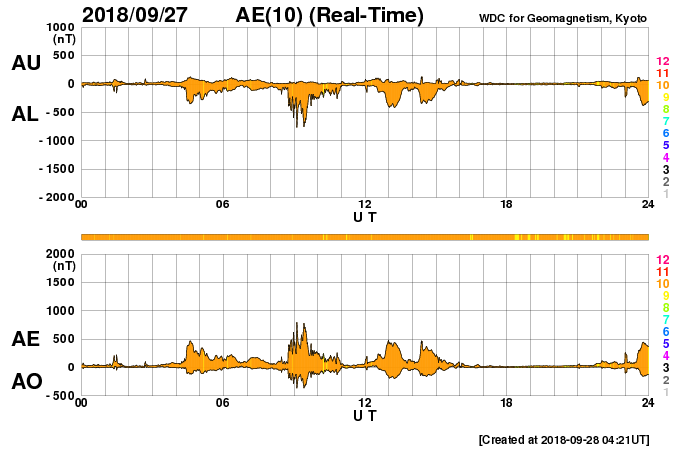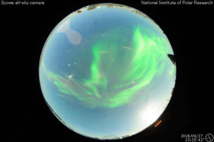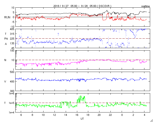 2018/ 9/28 13:31 更新 太陽風は平均的な速さが続いています。太陽は無黒点です。 担当 篠原 太陽風の速度は、420km/秒と平均的な速さが続いています。 磁場強度は、3nTとやや弱くなっています。 太陽風のグラフの後半に、 太陽風磁場の大まかな方向の変化が起きている様です。 磁場強度は特に変化していないのですが、 以降は南北成分が南寄りに推移している印象です。 磁気圏では、AE指数で500nT前後の中小規模の活動が 度々発生しています。 世界時27日23時半の500nTの高まりの頃のオーロラの様子を、 南極の昭和基地の全天カメラの動画で紹介します。 SDO衛星AIA193では、 東側のコロナホールが少し見やすくなっています。 今日の見え方では、前周期よりも少し小さくなっている様です。 太陽風への影響は弱くなる可能性があります。 太陽は無黒点で、穏やかです。 台風24号の影響で、鹿児島もやや強い東風が吹き続けています。 日曜日に最接近を迎えそうなので、 今日の夕方から月曜日まで学内LANを停止させるとのことです。 以降は、外部サーバーに避難してニュースの公開を続けます。 毎日の記事の更新は行いますが、最新情報の更新は停止します。 ご了解下さい。