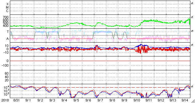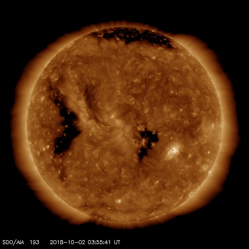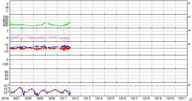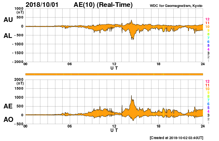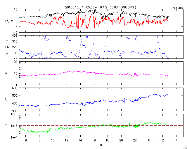 2018/10/ 2 13:01 更新 太陽風は高速になっています。磁気圏もやや活動的です。 担当 篠原 太陽風の速度は、今日に入った頃から高まり始め、 現在は500km/秒と高速の風になっています。 太陽風の磁場強度は、 速度が上がり始める前に9nT程度に高まりましたが、 現在は3nTへ下がってやや弱くなっています。 27日周期の図の前周期の太陽風と同様に、 速度の上下の変化が到来している様です。 太陽風磁場の南北成分は、 比較的南寄りに変化しています。 磁場強度が強まったので、南北の変化も大きくなり、 -5nT程度の南向きの変化も目立っています。 このため、磁気圏の活動もやや高まって、 AE指数では、300〜500nTの小規模の変化が連続的に発生し、 1000nTに達する大きい変化も起きています。 現在、磁場強度は下がっていますが、速度が高まっているので、 磁場の南向きの変化が続くと、 磁気圏もやや活動的な状態が続きそうです。 SDO衛星AIA193では、中央部のコロナホールが西に進み、 明日か明後日くらいに影響が始まるかもしれません。 また、東端のコロナホールは、全体が見やすくなってきました。 太陽は、2723黒点群が見えていますが、 昨日より小さくなっています。 ![]() SDO衛星のAIA193カメラによる太陽コロナの様子 (c) SDO (NASA) ![]() SDO衛星による太陽の可視光写真。マウスの矢印を写真に重ねると、黒点番号付きの写真に切り替わります。 (c) SDO (NASA) ![]() DSCOVRが観測した太陽風の磁場(1番上の枠、黒線は全体の強度、赤線は南北成分) および、太陽風の密度(3番目の紫線)、速度(4番目の青線) (c) データ:NOAA/SWPC、作図:宇宙天気ニュース ![]() AE指数(速報値) 下段のAEグラフの値が高くなると、オーロラ活動が活発化しています。 (c) 京都大学WDC ![]() ![]() 27日の太陽周期に合わせたデータプロット 太陽が同じ面を地球に向けていた27日前の変化から、今後を予想することができます。 (c) 作図:宇宙天気ニュース