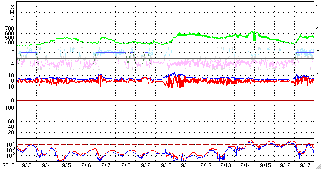 磁場の南北成分は、0nT付近で小さく南北に変化しています。