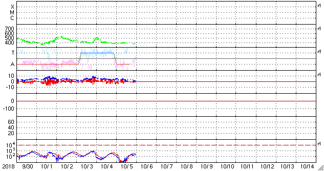 2018/10/ 2 13:01 太陽風は高速になっています。磁気圏もやや活動的です。