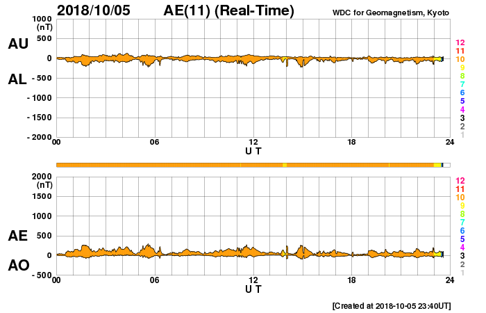 下段のAEグラフの値が高くなると、オーロラ活動が活発化しています。