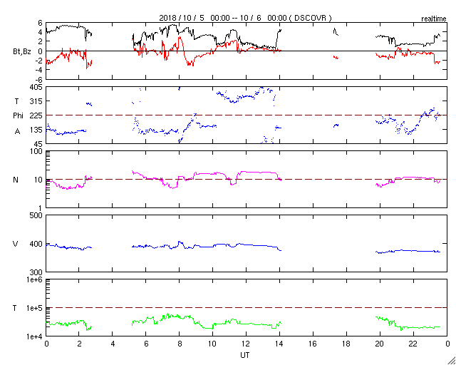 2018/10/ 3 12:25 太陽風は平均的な速さに戻っています。磁気圏も穏やかです。
