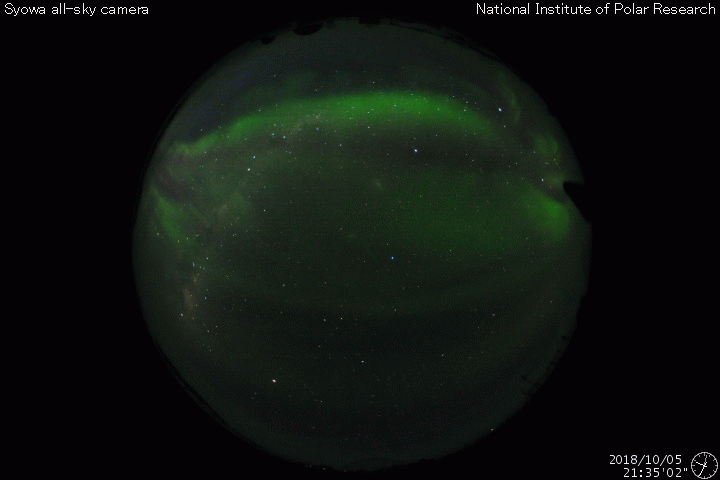 南極・昭和基地の全天カメラで、世界時5日21時半に撮影されたオーロラ。