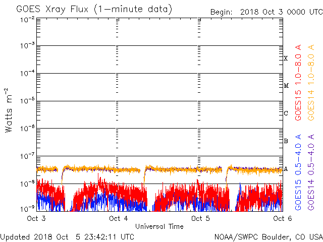 2018/10/ 5 12:55 太陽風はやや低速になっています。9月の黒点数は 3.3 でした。