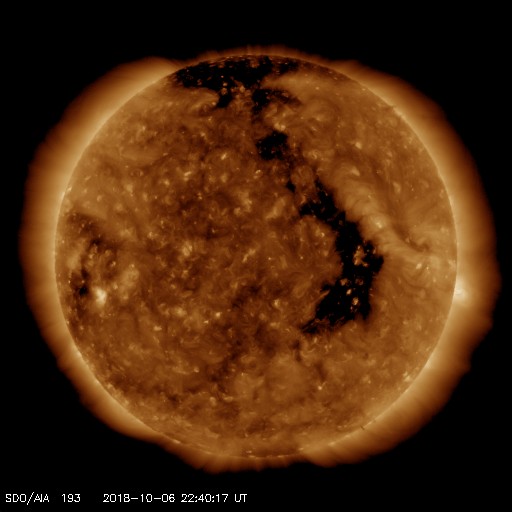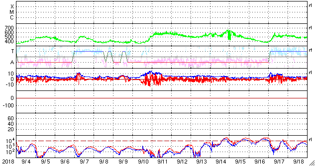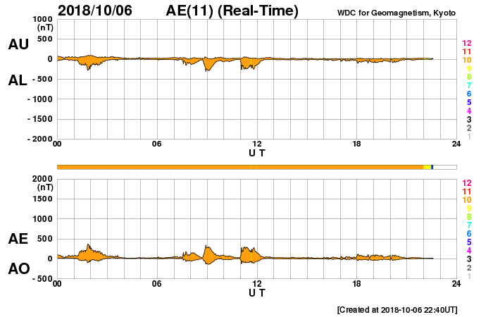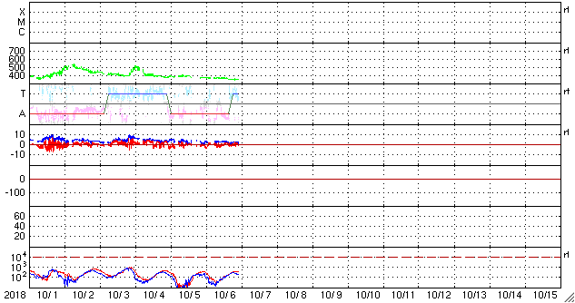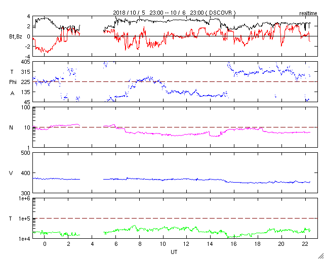 2018/10/ 7 07:57 更新 太陽風は低速で磁気圏も穏やかです。 担当 篠原 太陽風の速度は、370km/秒から350km/秒へ下がり、 低速の状態です。 磁場強度も、2〜3nTと弱まった状態です。 とても穏やかな太陽風が続いています。 太陽風磁場の南北成分は、 グラフの前半は弱い南寄りでしたが、 後半は弱い北寄りに変わっています。 27日周期の図を見ると、太陽風磁場の大まかな方向が 「A」から「T」に切り替わっています(セクターのグラフ)。 前周期の9月8〜9日も短期的な切り替わりが発生しているので、 同様の変化が回帰しているのかもしれません。 前周期は9月10日の中程から、 太陽風の磁場、速度の高まりが始まっています。 今回も同様であれば、 今夜か明日の午前中には変化が始まりそうです。 現在の磁気圏は穏やかで、 AE指数は小さい変化が見られる程度です。 太陽は無黒点です。 穏やかに推移しています。 缶サット甲子園全国大会2日めは、 ロケットで缶サットの打ち上げ、投下を行います。 台風は通りすぎて晴天になっています。 風が弱ければ実施できそうです。 ![]() SDO衛星のAIA193カメラによる太陽コロナの様子 (c) SDO (NASA) ![]() SDO衛星による太陽の可視光写真 (c) SDO (NASA) ![]() DSCOVRが観測した太陽風の磁場(1番上の枠、黒線は全体の強度、赤線は南北成分) および、太陽風の密度(3番目の紫線)、速度(4番目の青線) (c) データ:NOAA/SWPC、作図:宇宙天気ニュース ![]() AE指数(速報値) 下段のAEグラフの値が高くなると、オーロラ活動が活発化しています。 (c) 京都大学WDC ![]() 27日の太陽周期に合わせたデータプロット 太陽が同じ面を地球に向けていた27日前の変化から、今後を予想することができます。 (c) 作図:宇宙天気ニュース