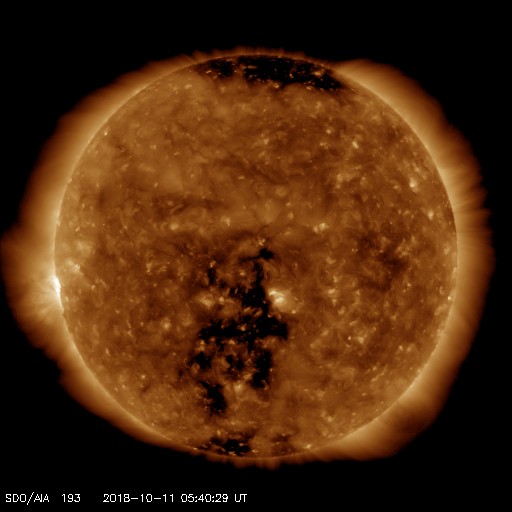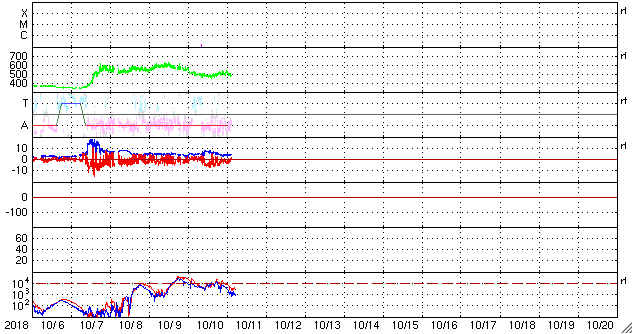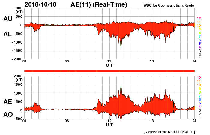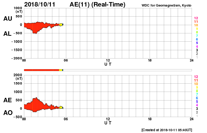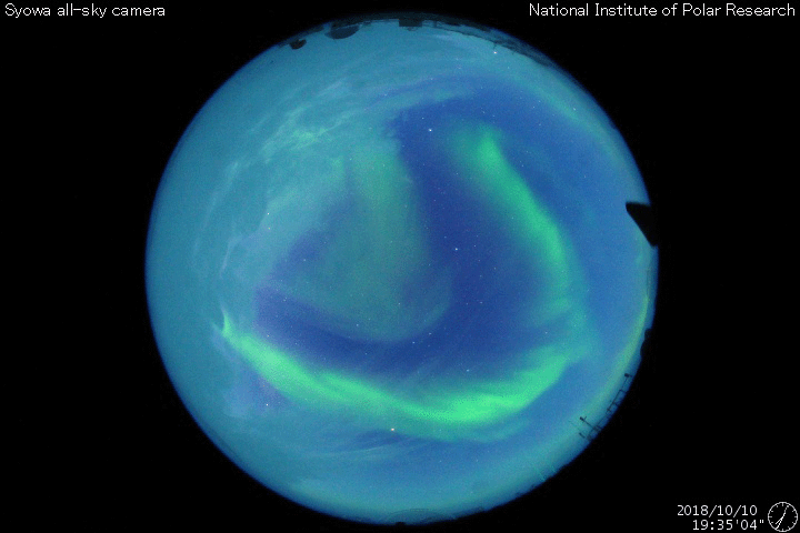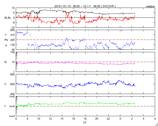 2018/10/11 14:49 更新 太陽風磁場が南向きに強まり、磁気圏の活動が高まりました。 担当 篠原 昨夜、10日19時(世界時10日10時)頃、 太陽風の磁場強度が5nTから7nTに少し強まりました。 変化としては小さいですが、 南北成分が南向きに大きく振れる様になり、 -5〜 -6nTの南向きが数時間にわたって続きました。 速度は500km/秒と高速の状態が続いていたため、 磁気圏の活動は高まって、 AE指数は1000nTに達する大きな変化になり、 最大で1500nTと1200nTのピークも発生しています。 この2つめの高まりの頃にあたる、 世界時10日19時半のオーロラの様子を、 昭和基地の全天カメラの動画で紹介します。 激しいオーロラの輝きが、 画面の右から左へ進んでいく様子が見えています。 太陽風磁場強度の高まりは、今日の未明に終わって、 現在は4nTと平均的な状態です。 南北成分も0nT近くで落ち着いています。 このため、磁気圏の活動は次第に小さくなっている様です。 27日周期の図を見ると、 太陽風速度の高まりは、前周期と同様に推移しています。 このままもう2日ほど続いて、 次のコロナホールの変化に繋がるのでしょうか。 引き続き注目してください。 太陽で昨日小さく見えていた黒点は、 その後消えて無黒点になっています。 放射線帯の高エネルギー電子は、 今日も両衛星で1万に達していますが、 昨日よりは少し下がっています。 太陽風の高まりが続いているので、引き続き注目してください。 ![]() 南極・昭和基地の全天カメラで、世界時10日19時半に撮影されたオーロラ。 (c) 国立極地研究所、(動画加工 : 宇宙天気ニュース) ![]() SDO衛星のAIA193カメラによる太陽コロナの様子 (c) SDO (NASA) ![]() SDO衛星による太陽の可視光写真 (c) SDO (NASA) ![]() DSCOVRが観測した太陽風の磁場(1番上の枠、黒線は全体の強度、赤線は南北成分) および、太陽風の密度(3番目の紫線)、速度(4番目の青線) (c) データ:NOAA/SWPC、作図:宇宙天気ニュース ![]() AE指数(速報値) 下段のAEグラフの値が高くなると、オーロラ活動が活発化しています。 (c) 京都大学WDC ![]() ![]() 27日の太陽周期に合わせたデータプロット 太陽が同じ面を地球に向けていた27日前の変化から、今後を予想することができます。 (c) 作図:宇宙天気ニュース