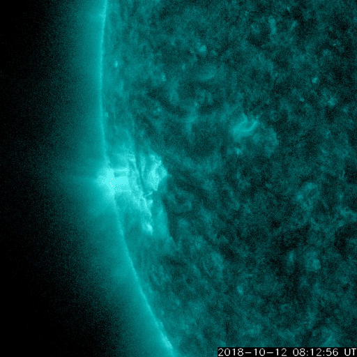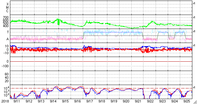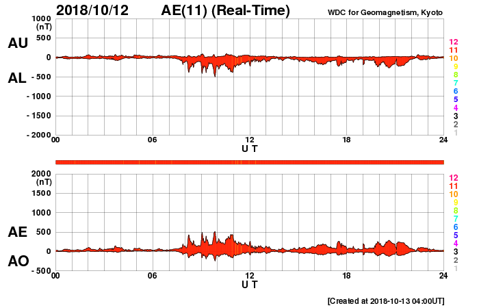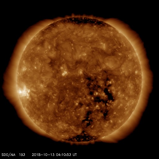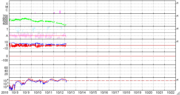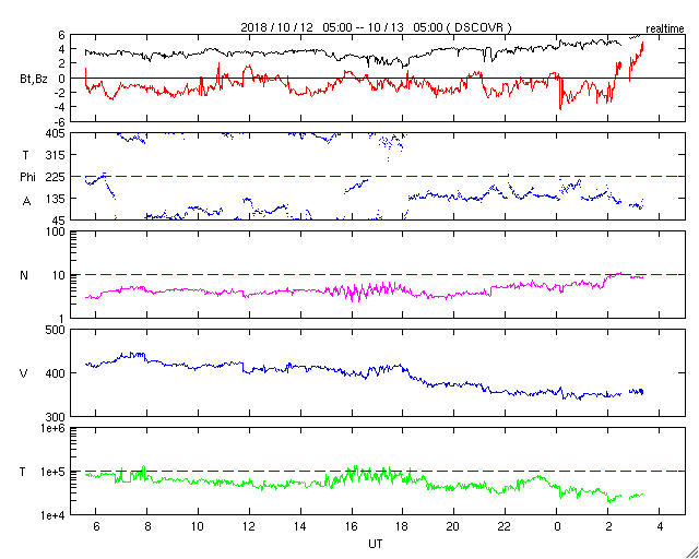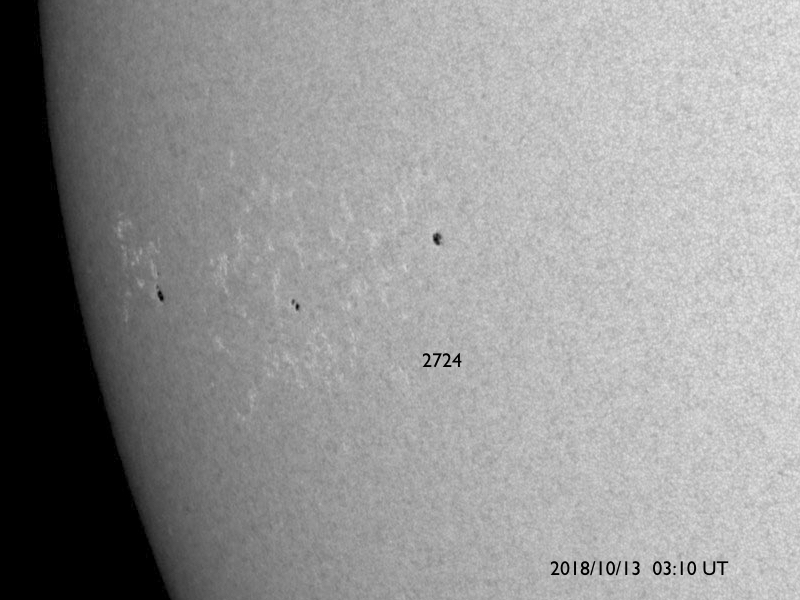 2018/10/13 13:18 更新 太陽の東端に黒点が並んでいます。太陽風は低速になっています。 担当 篠原 太陽の東端に現れた黒点には、2724黒点群と番号が付きました。 今日の写真では、この黒点に続く様に、 左側に2つの新しい黒点が現れています。 SDO衛星による拡大写真を掲載します。 2724群では小さい活動も起きていて、 12日23時(世界時12日14時)に、 B7.1の小さいフレアが発生しています。 SDO衛星AIA131による動画を掲載します。 この規模に達するフレアの発生は、 7月6日のC1.6以来です。 規模としては小さい活動ですが、それでも3か月ぶりの発生です。 太陽風の速度は、昨日の夜には400km/秒に下がり、 今日に入ると、350km/秒と低速の状態になっています。 前周期は400km/秒くらいで止まったのですが、 今回はもう一段遅くなっています。 太陽風の磁場強度は、 昨日から3〜4nTとやや弱い状態が続いていましたが、 今朝くらいからやや上がり始め、現在は6nTです。 小さい変化ですが、この後も強まりが続くと、 次の高速風の始まりに繋がりそうです。 太陽風磁場の南北成分は、弱い南寄りで推移しています。 磁気圏では、小規模の活動が続き、 AE指数は、300〜500nTの小規模の変化が、 繰り返し発生しています。 速度が下がっているので、 今後の変化は小さい規模に留まりそうです。 一方、次の高速太陽風が近付いています。 前周期の変化を参考にすると、明日の朝くらいかもしれません。 今夜以降、注目してください。 放射線帯の高エネルギー電子は、高い状態が続いています。 太陽風の高まりは終わったので、 今後は低下に向かいそうですが、 次の高速風が始まると、再び様々な変化を見せるでしょう。
