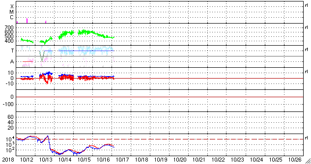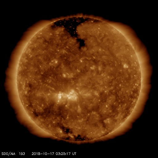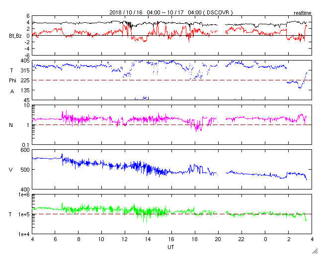 2018/10/17 12:41 更新 高速太陽風は終わりかけています。太陽に小さい黒点が見えています。 担当 篠原 太陽風の速度は、ゆっくりと下がって、 昨夜遅くに500km/秒を割り、 現在は470km/秒とやや高速になっています。 磁場強度も、3〜4nTとやや弱くなっています。 太陽風速度の高まりは、終わりに近付いています。 27日周期の図を見ると、 前周期よりも1日くらい長く続いた様です。 太陽風磁場の南北成分は、 0nT付近か、弱い北寄りの傾向です。 磁気圏はだいぶ静かになっていて、 AE指数は、小さい変化が数回起きている程度です。 SDO衛星AIA193の太陽コロナ写真では、 コロナホールが、北極から中緯度にかけて細く伸びています。 前周期は、9月22日から2日程度、 太陽風に影響が見られました。 今回はどうなるでしょうか。 始まりは、10月19日か、20日くらいになりそうです。 太陽は、南半球の2725黒点群に、 小さい黒点が見えている様です。 ![]() SDO衛星のAIA193カメラによる太陽コロナの様子 (c) SDO (NASA) ![]() SDO衛星による太陽の可視光写真。マウスの矢印を写真に重ねると、黒点番号付きの写真に切り替わります。 (c) SDO (NASA) ![]() DSCOVRが観測した太陽風の磁場(1番上の枠、黒線は全体の強度、赤線は南北成分) および、太陽風の密度(3番目の紫線)、速度(4番目の青線) (c) データ:NOAA/SWPC、作図:宇宙天気ニュース ![]() AE指数(速報値) 下段のAEグラフの値が高くなると、オーロラ活動が活発化しています。 (c) 京都大学WDC ![]() ![]() 27日の太陽周期に合わせたデータプロット 太陽が同じ面を地球に向けていた27日前の変化から、今後を予想することができます。 (c) 作図:宇宙天気ニュース